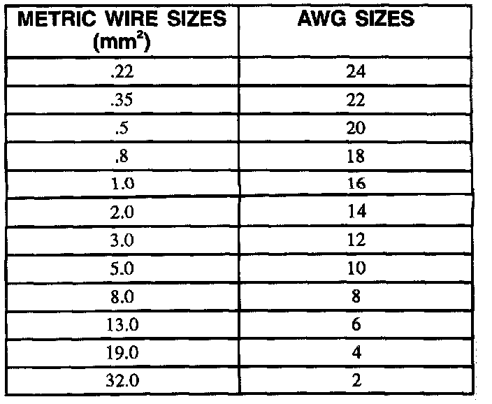 When replacing a wire, use a wire of the same size as the original wire or larger. The schematics list wire size in metric units. The table shows the commercial (AWG) wire sizes that can be used to replace each metric wire size. Each AWG size is either equal to or larger than the equivalent metric size.