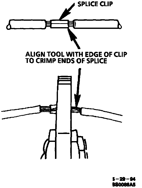 Select the proper clip to secure the splice. To determine the proper clip size for the wire being spliced, follow the directions included in the J 38125-A Terminal Repair Kit Select the correct anvil on the crimpers (On most crimpers your choice is limited to either a small or large anvil.) Overlap the stripped wire ends and hold them between your thumb and forefinger as shown. Then, center the splice clip under the stripped wires and hold it in place.