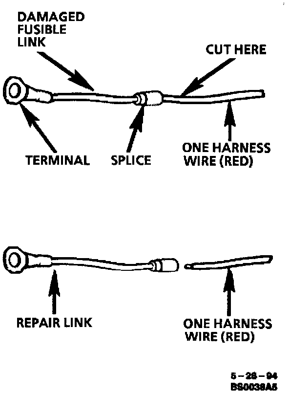 To replace a damaged fusible link which feeds two harness wires, cut them both off beyond the splice. Use two repair links, one spliced to each harness wire.