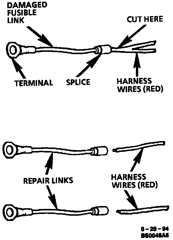 To replace a damaged fusible link, cut it off beyond the splice. Replace with a repair link. When connecting the repair link, strip wire and use staking-type pliers to crimp the splice securely in two places. For more details on splicing procedures, Refer "Typical Electrical Repair" Use crimp and seal splices whenever possible. Typical Electrical Repair Procedures
