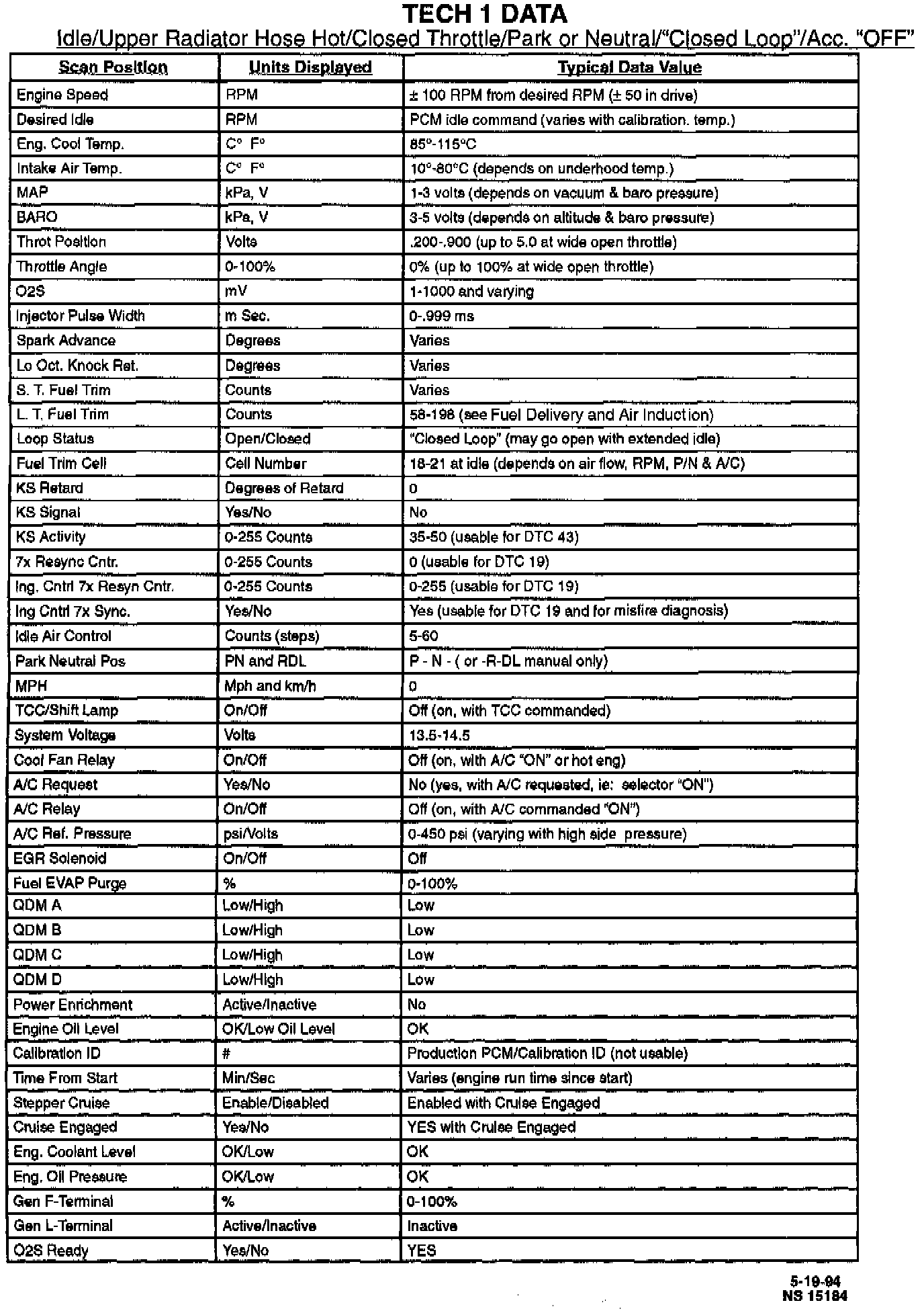 The Tech I data listed in the table may be used for comparison, after completing the OBD system check and finding the on-board diagnostics functioning properly and no diagnostic trouble codes displayed. The "Typical Values" are an average of display values recorded from normally operating vehicles and are intended to represent what a normally functioning system would typically display.