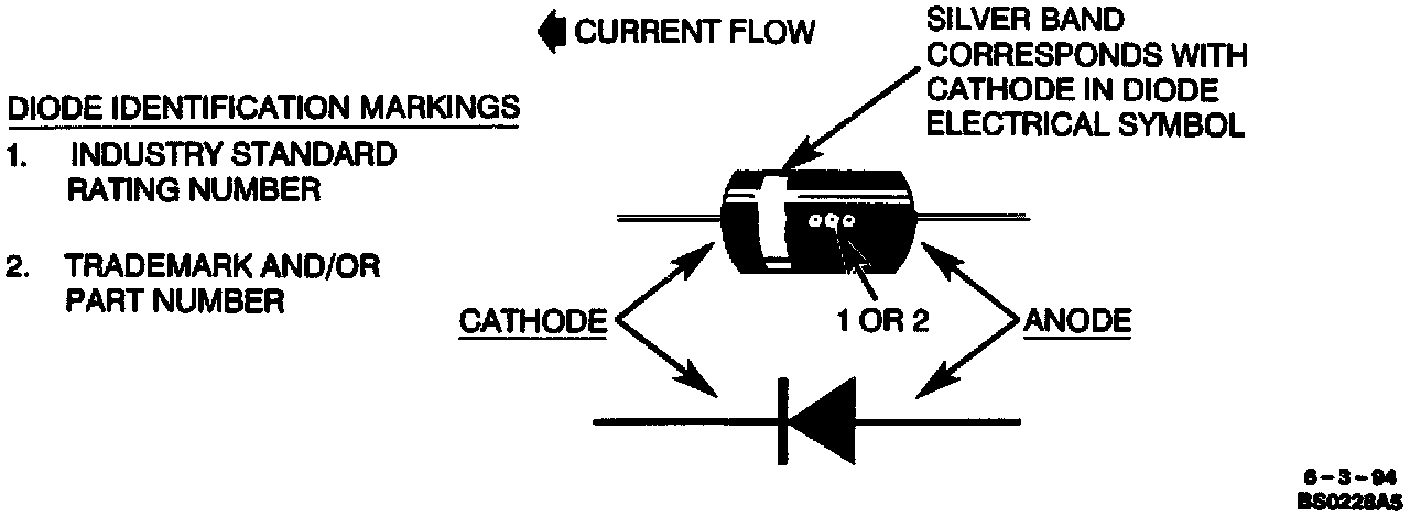 Check current flow direction of the new diode, being sure to install the diode with correct bias. Refer to Figure for replacement diode symbols and current flow explanations. Attach the new diode to the wire(s) using 6O/40 rosin core solder. Use a heat sink (aluminum alligator clip) attached across the diode wire ends to protect the diode from excess heat. Follow the manufacturer's instructions for the soldering equipment you are using.