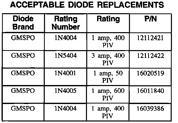In the event 1 amp, 50 Peak Inverse Rating (PIV) diodes are unavailable, a universal diode with a 1 amp, 400 PIV rating can be used for the following applications:
