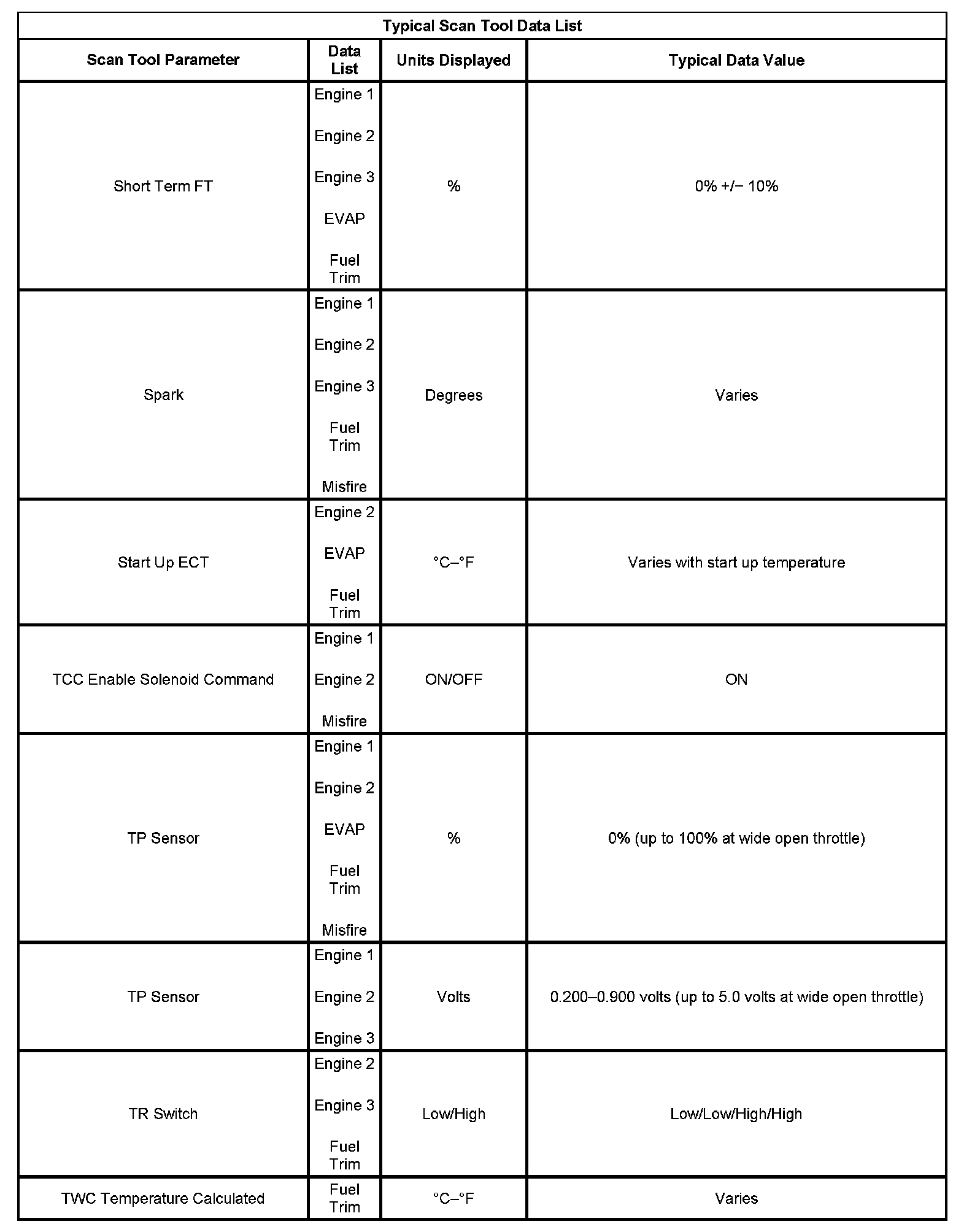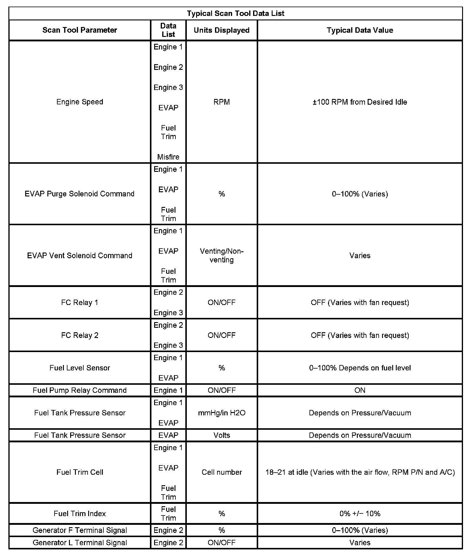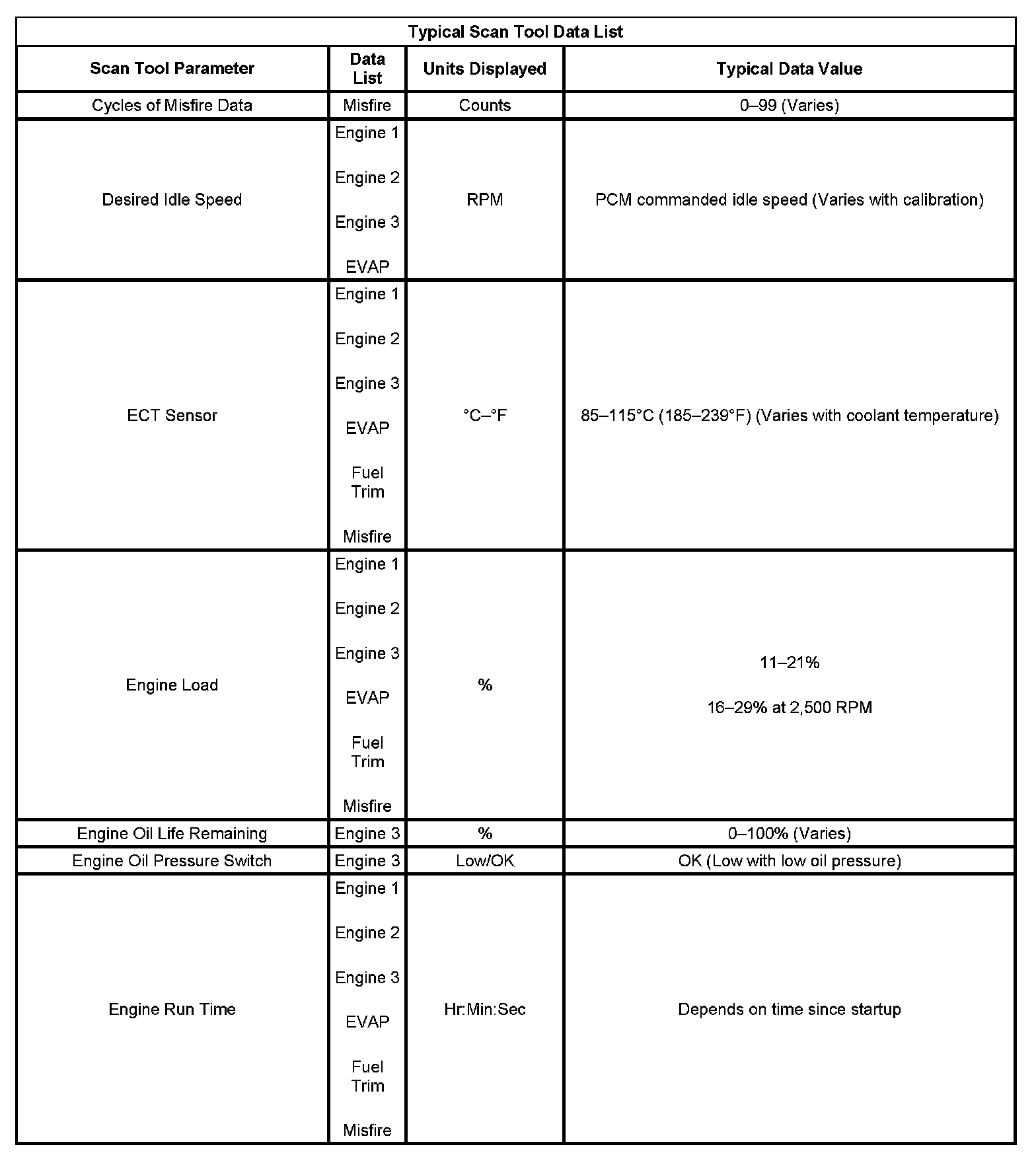 The Engine Scan Tool Data List contains all engine related parameters that are available on the scan tool. The list is arranged in alphabetical order. The parameters in the Typical Scan Data values column represent values that would be seen on a normally running engine.