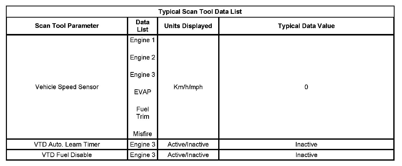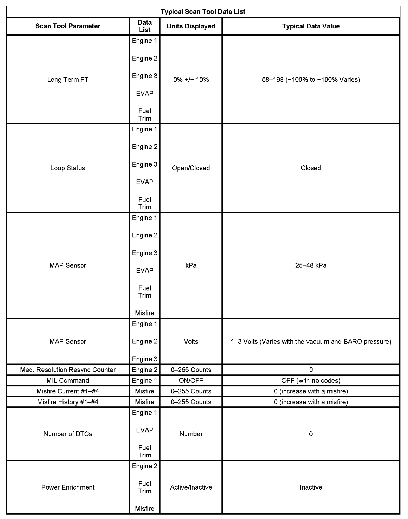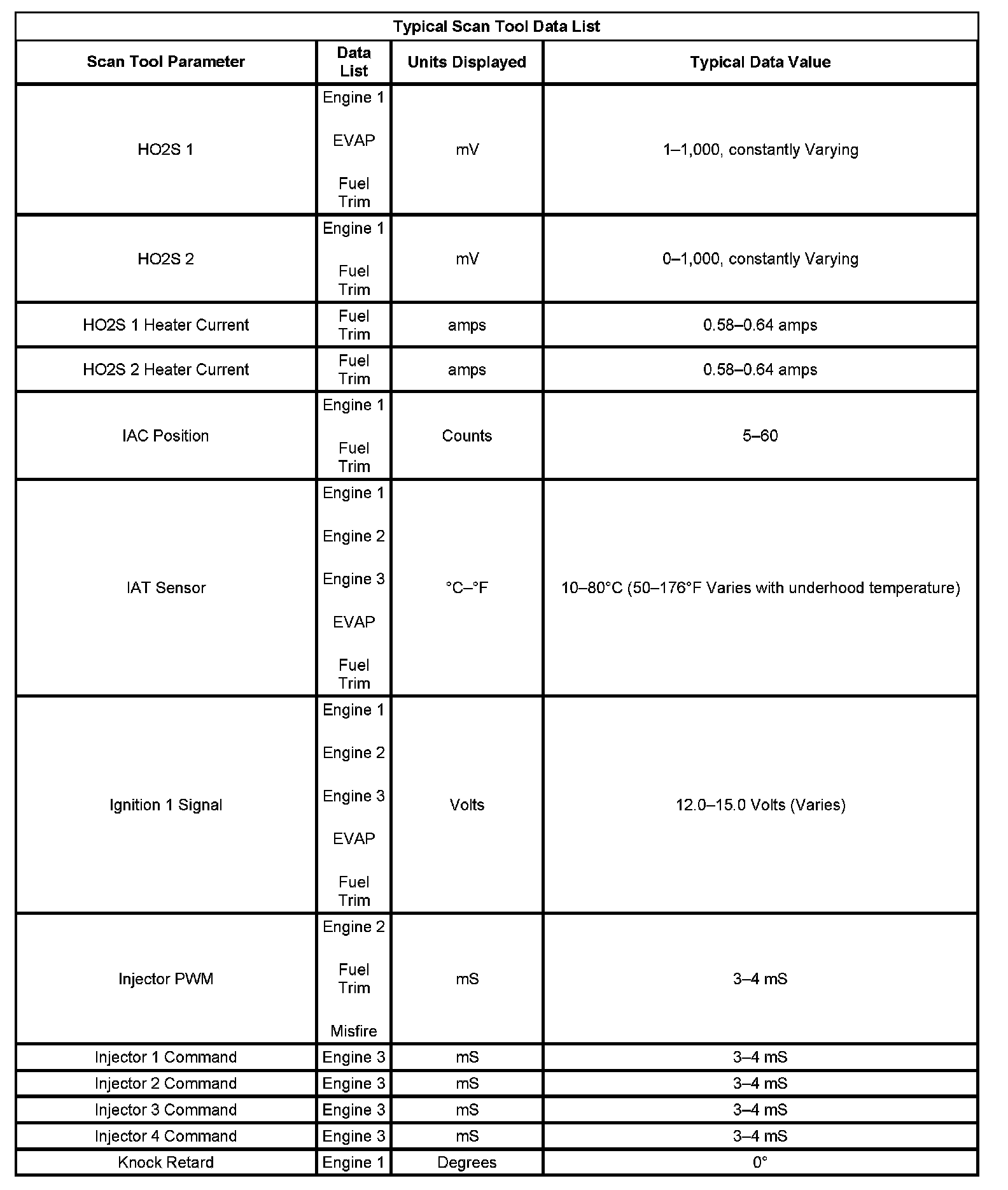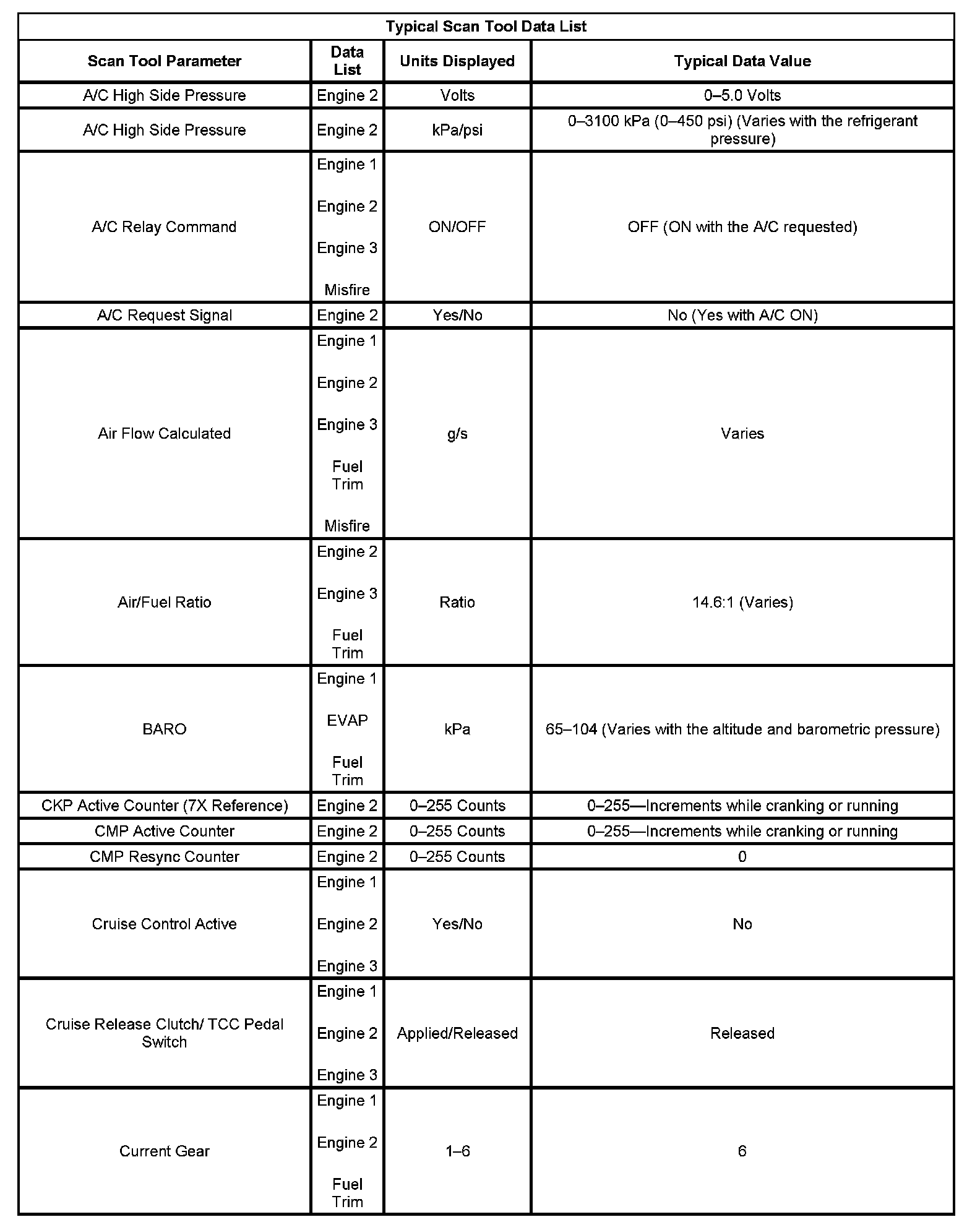 The Engine Scan Tool Data List contains all engine related parameters that are available on the scan tool. The list is arranged in alphabetical order. The parameters in the Typical Scan Data values column represent values that would be seen on a normally running engine.