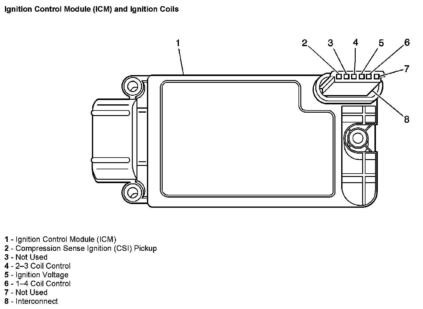 The engine control module (ECM) supplies a signal on each of the ignition control (IC) timing control circuits to the ignition control module (ICM). The ICM fires the correct ignition coil at the correct time based on the signals. The ICM detects if cylinder 1 or cylinder 3 is on the compression stroke by sensing the secondary voltage and polarity of each side of the ignition coil. The ICM detects this voltage with sensing circuitry integrated into each ignition coil. The higher voltage is on the compressing cylinder. This is called compression sense ignition. The ICM provides a synthesized cam signal to the ECM based on these inputs. The ECM uses the cam signal to synchronize fuel injection.