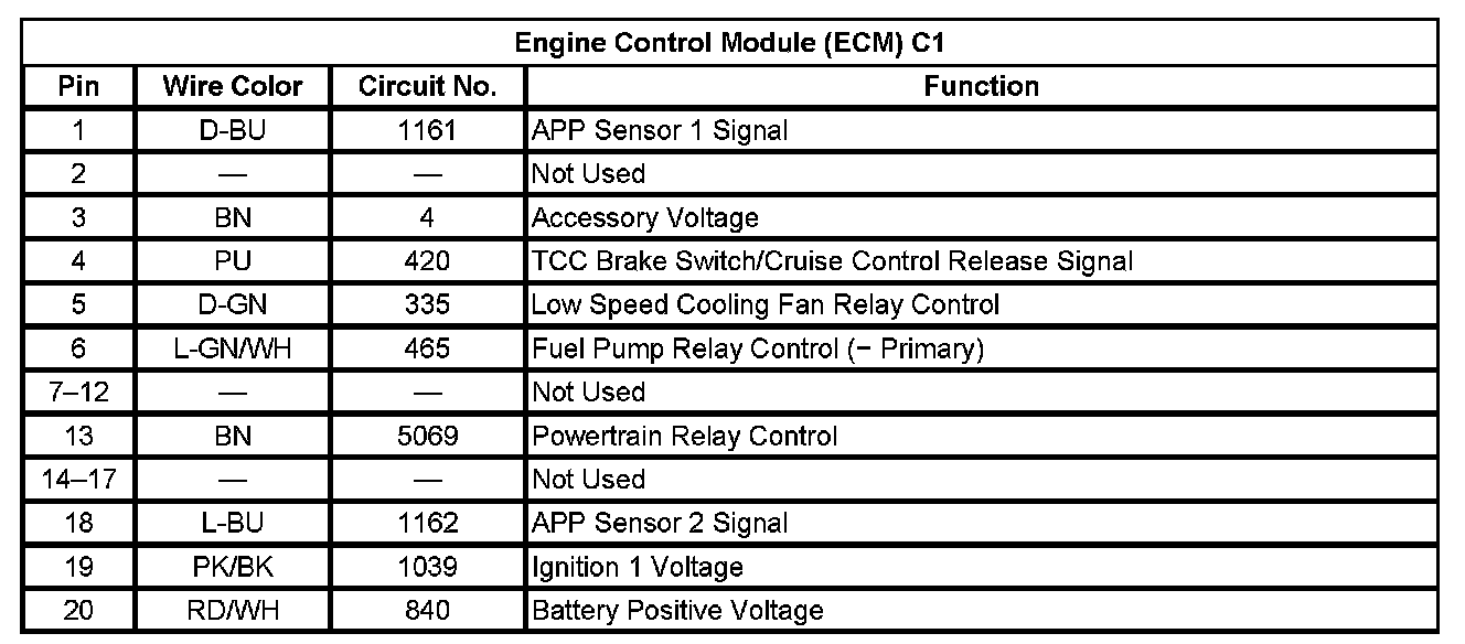 Engine Control Module (ECM) C1 (Pin 1 To Pin 20):