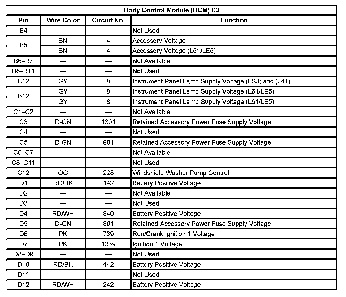 Body Control Module (BCM) C3 (Pin B4 To D12):