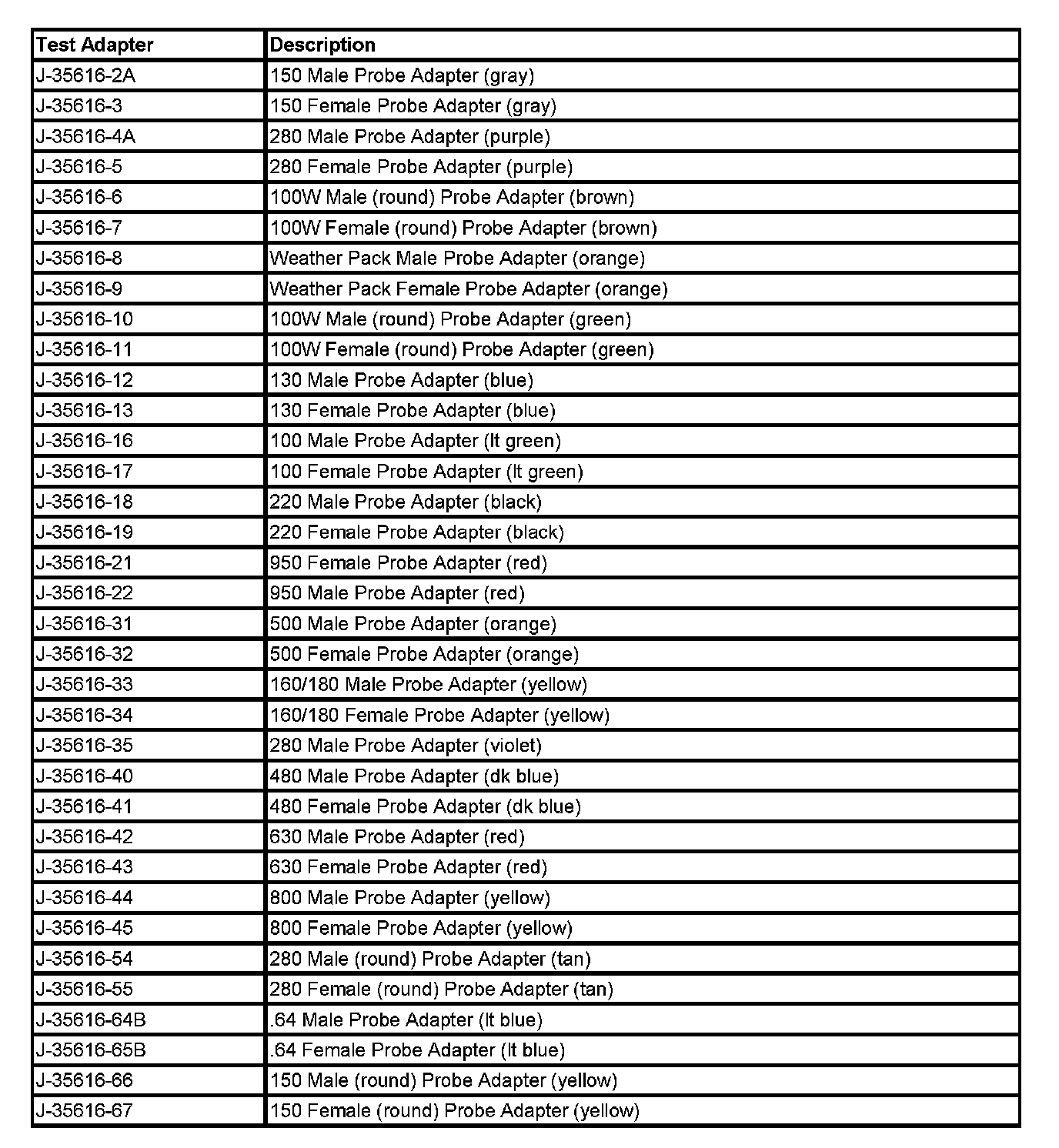NOTE: Do not insert test equipment probes (DVOM etc.) into any connector or fuse block terminal. The diameter of the test probes will deform most terminals. A deformed terminal will cause a poor connection, which will result in a system failure. Always use the J-35616 GM-Approved Terminal Test Kit in order to front probe terminals. Do not use paper clips or other substitutes to probe terminals.