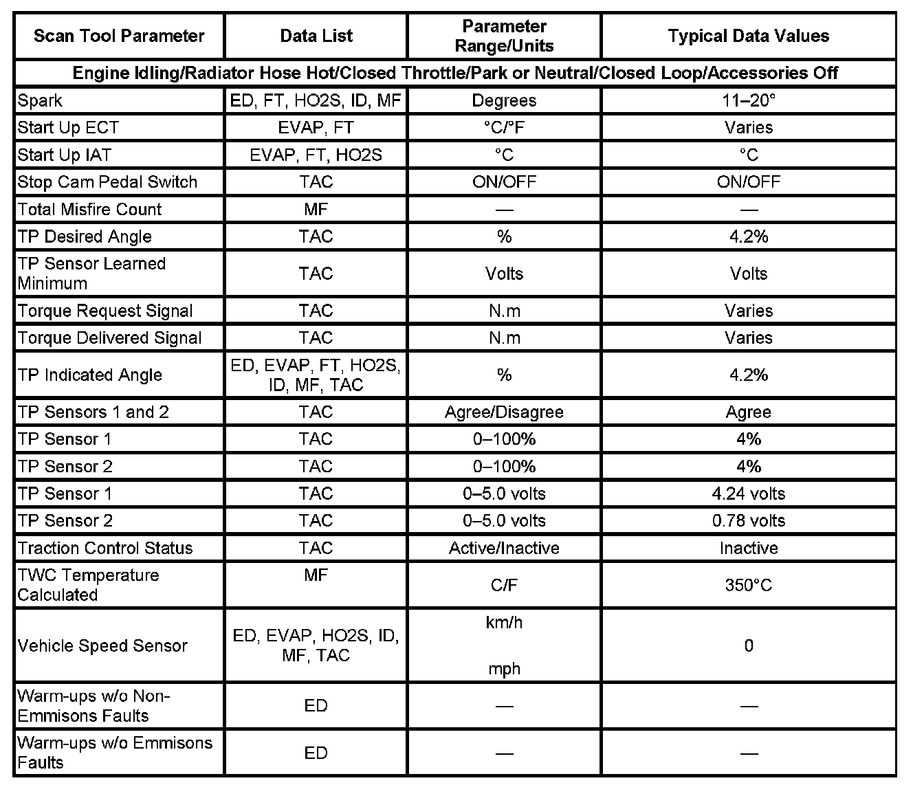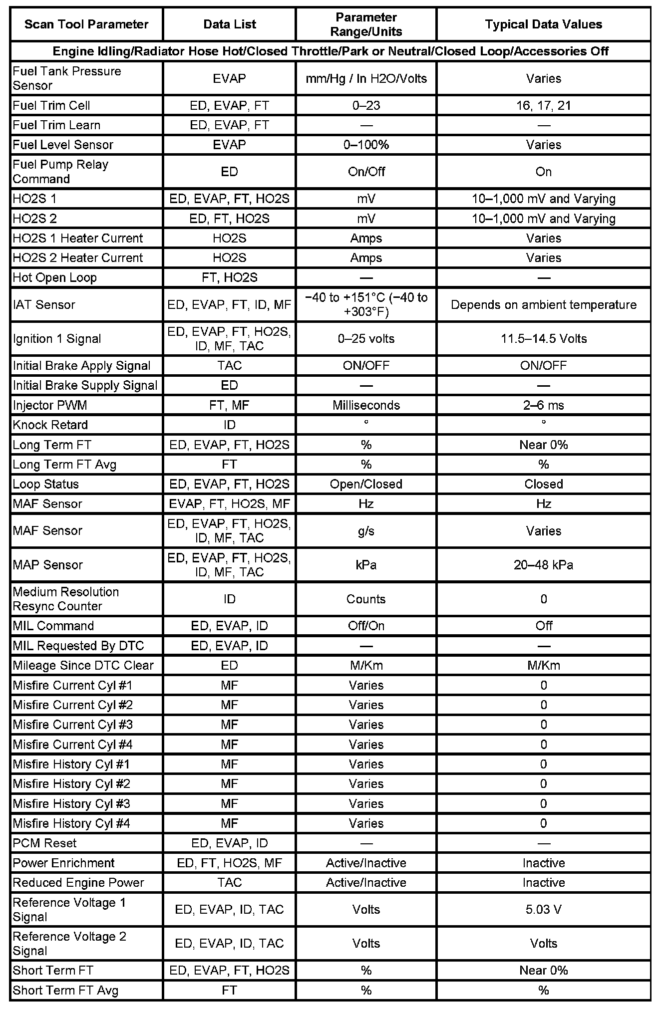 The Engine Scan Tool Data List contains all engine related parameters that are available on the scan tool. The list is arranged in alphabetical order. A given parameter may appear in any one of the data lists, and in some cases may appear more than once, or in more than one data list in order to group certain related parameters together.