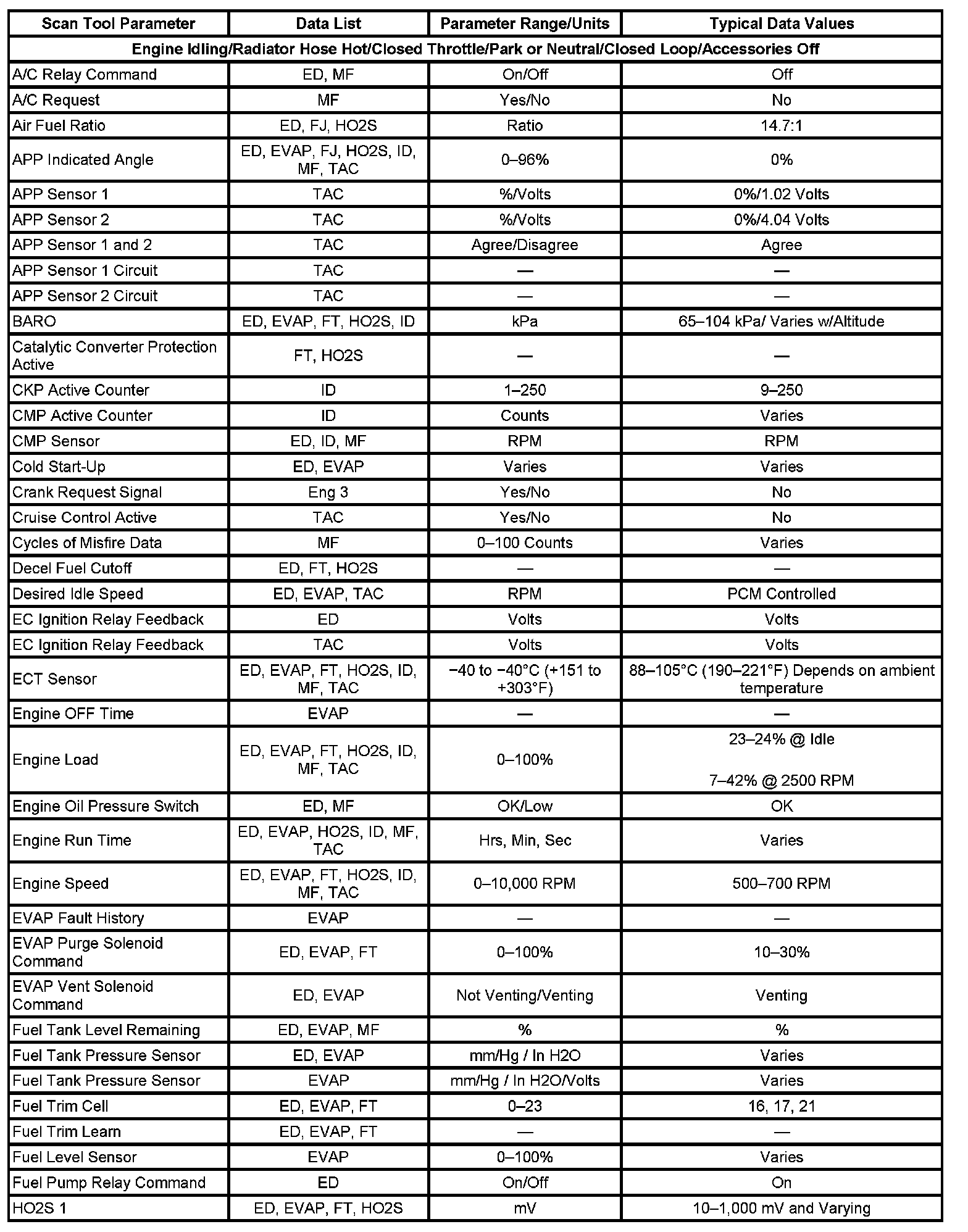 The Engine Scan Tool Data List contains all engine related parameters that are available on the scan tool. The list is arranged in alphabetical order. A given parameter may appear in any one of the data lists, and in some cases may appear more than once, or in more than one data list in order to group certain related parameters together.