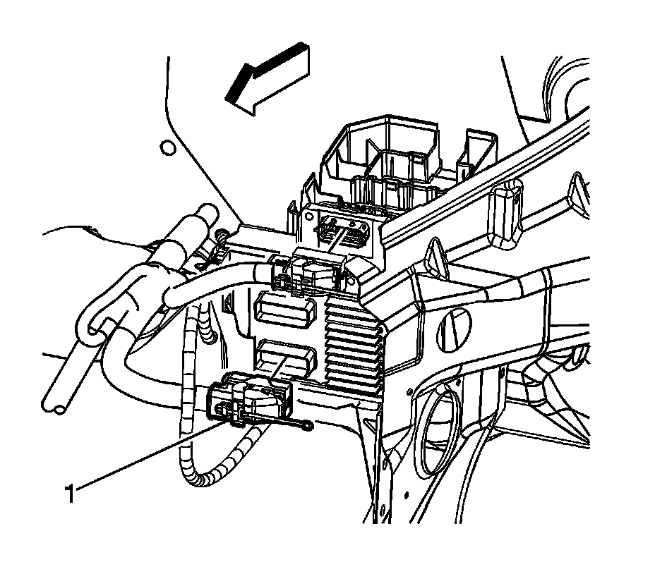6. Release the retaining tab (1) in order to release the ECM from the underhood junction block bracket.