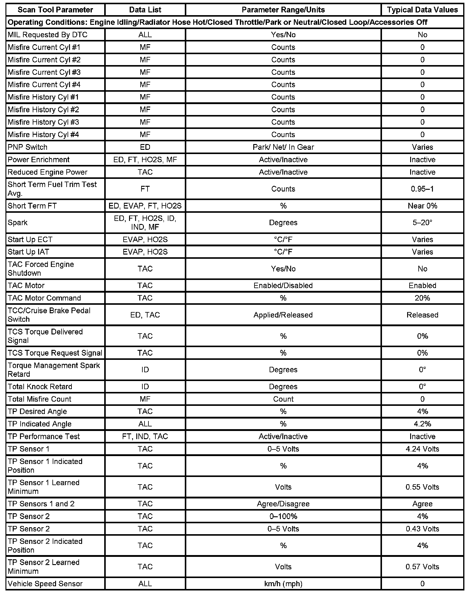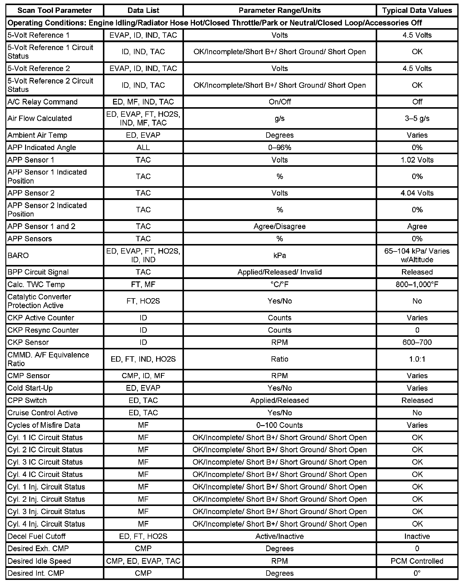 Scan tool values from a properly running engine may be used for comparison with the engine you are diagnosing. The Engine Scan Tool Data List represents values that would be seen on a normal running engine.
