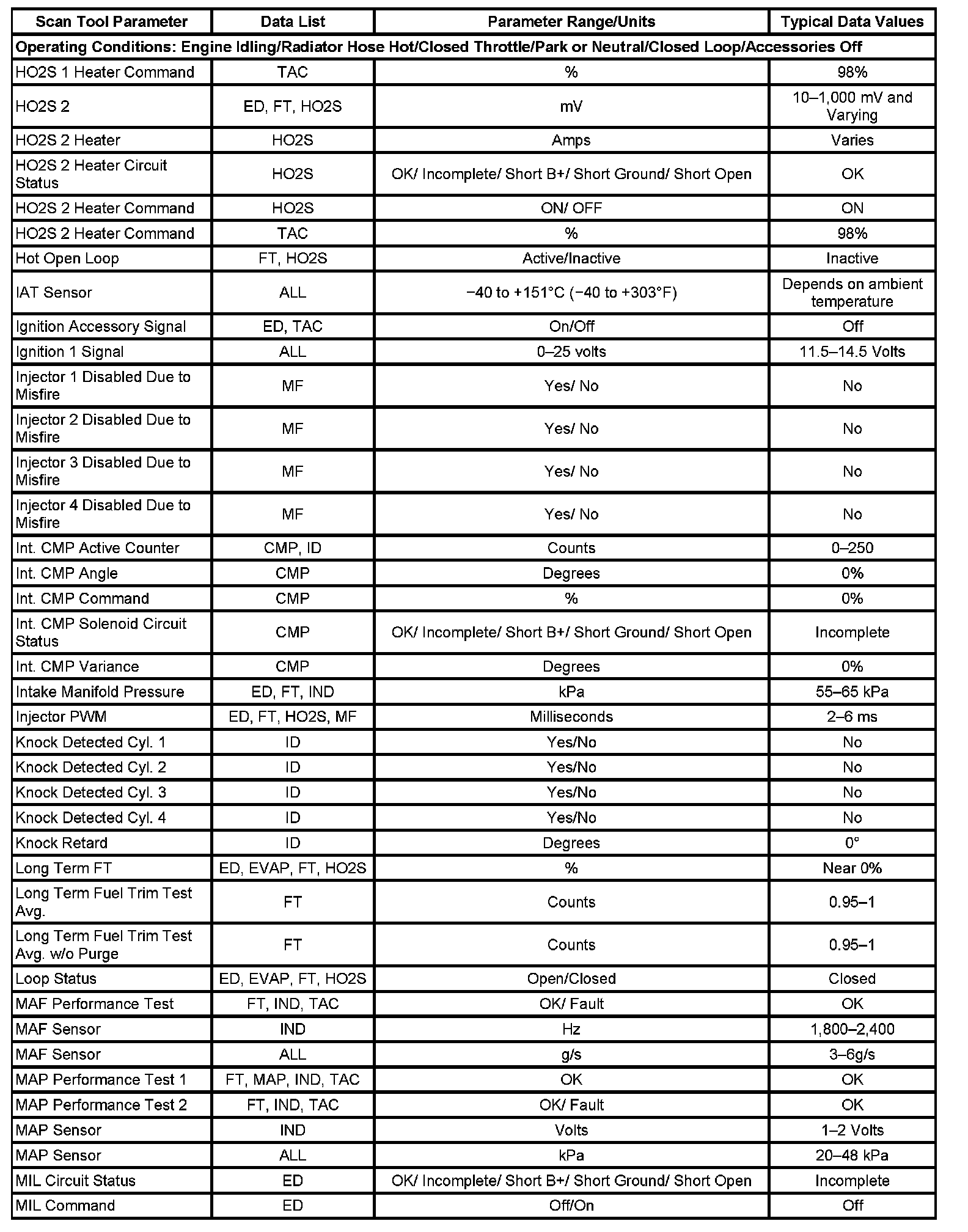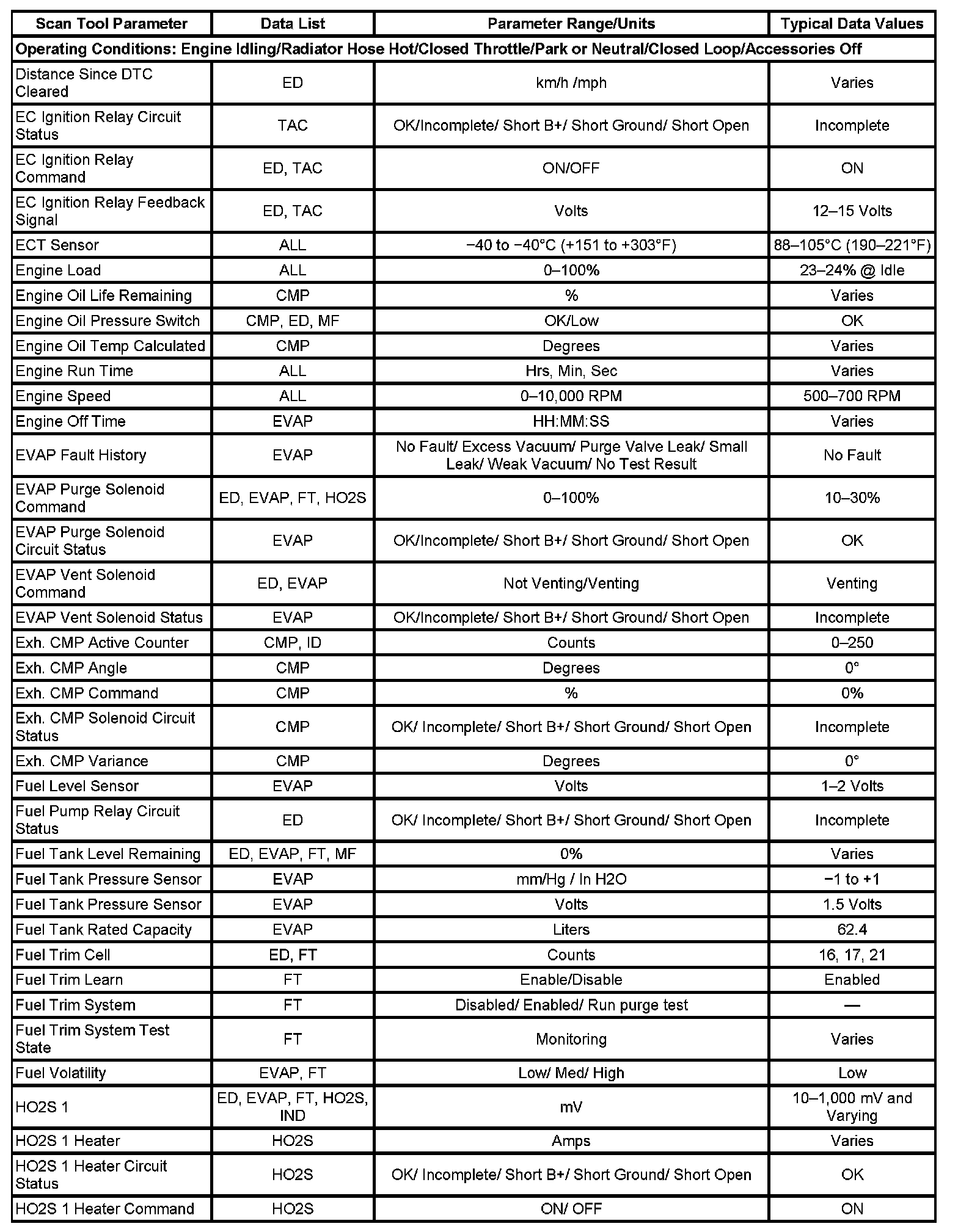 The Engine Scan Tool Data List contains all engine related parameters that are available on the scan tool. The list is arranged in alphabetical order. A given parameter may appear in any one of the data lists, and in some cases may appear more than once, or in more than one data list in order to group certain related parameters together.