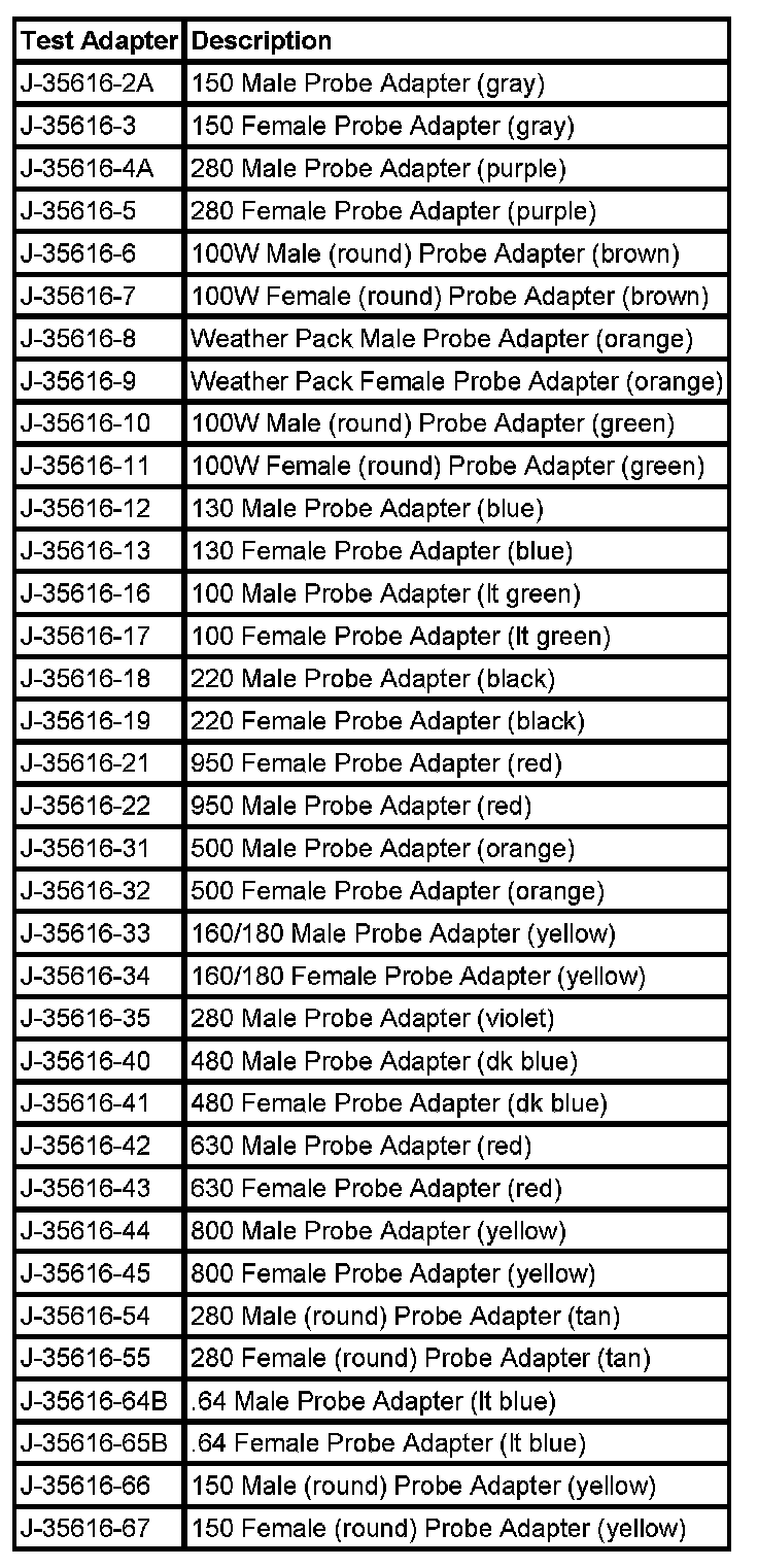 Notice: Do not insert test equipment probes (DVOM etc.) into any connector or fuse block terminal. The diameter of the test probes will deform most terminals. A deformed terminal will cause a poor connection, which will result in a system failure. Always use the J-35616 GM-Approved Terminal Test Kit in order to front probe terminals. Do not use paper clips or other substitutes to probe terminals.