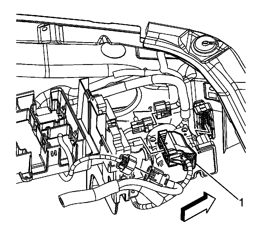 1. Install the ECM, securing the ECM to the underhood junction block bracket retaining tab (1).