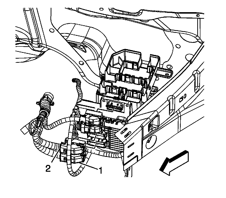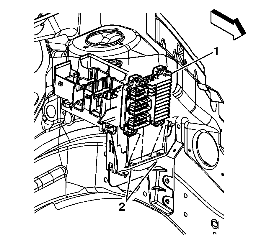 1. Slide the ECM (1) into the ECM/TCM bracket until the retaining tabs (2) engage the ECM.