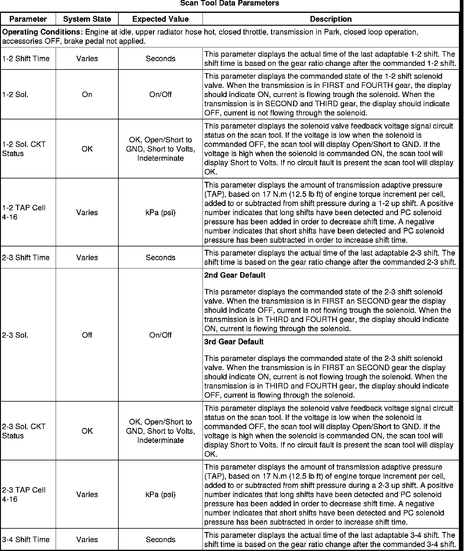 The Transmission Control Module Scan Tool Data List contains all transmission related parameters that are available on the scan tool. The list is arranged in alphabetical order. A given parameter may appear in any one of the data lists, and in some cases may appear more than once, or in more than one data list in order to group certain related parameters together.