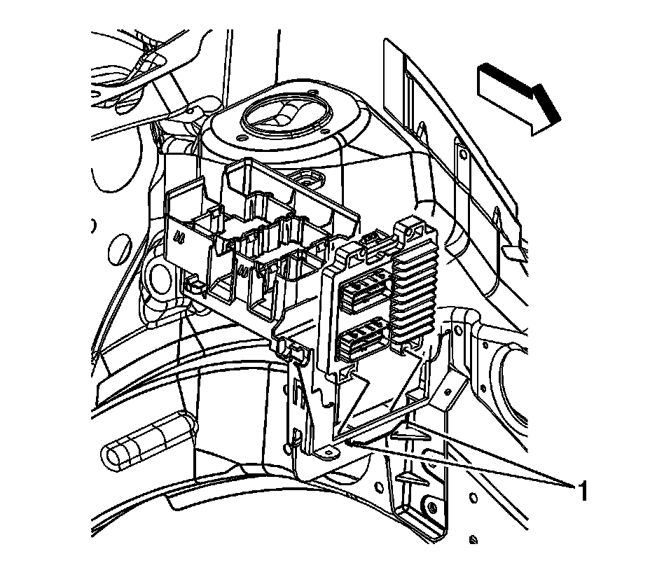 6. Release the retaining tab (1) in order to release the ECM from the underhood junction block bracket.