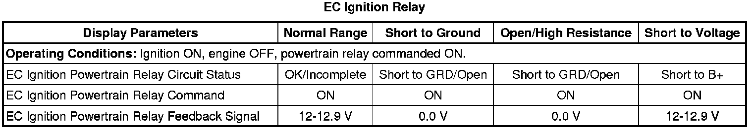 12. Ignition ON, engine OFF, monitor the EC Ignition Relay Feedback parameter with a scan tool. The parameter should display B+.