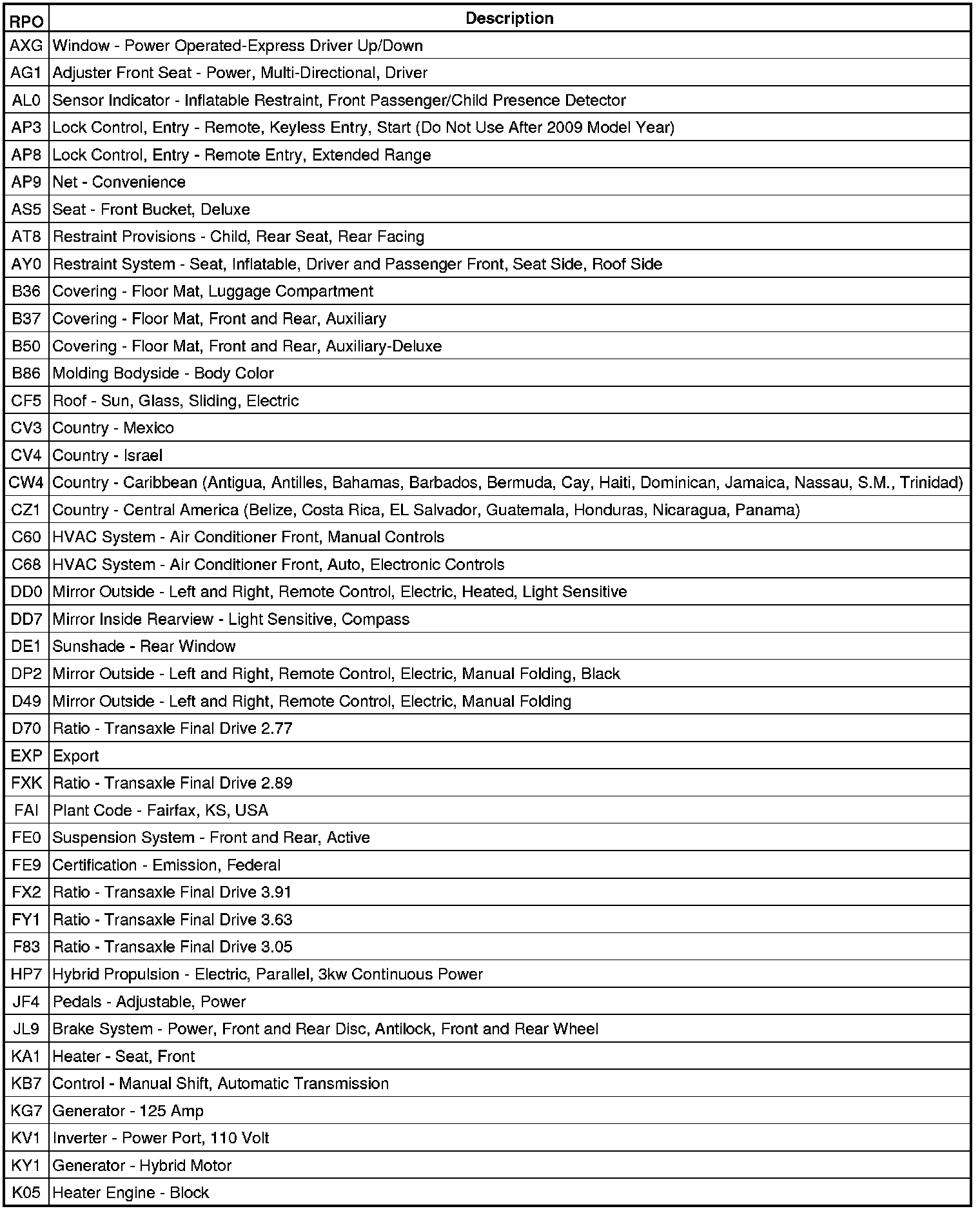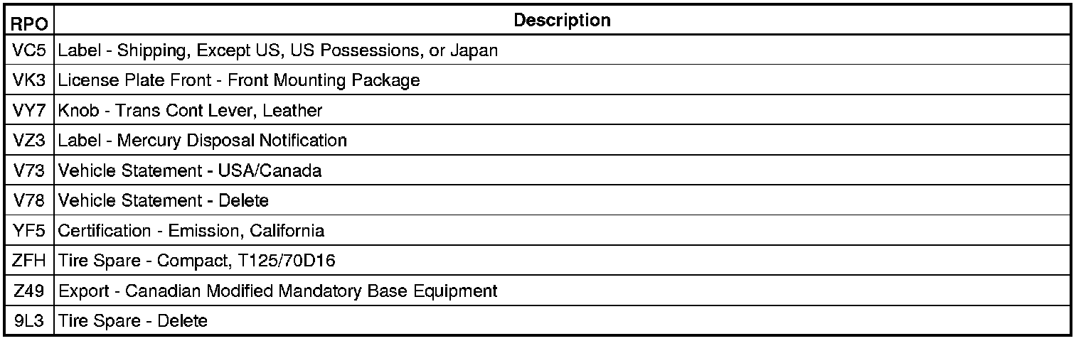 The following table provides the description of the Regular Production Option (RPO) codes that are available on the vehicle. The vehicle's RPO list is printed on the Service Parts Identification Label.