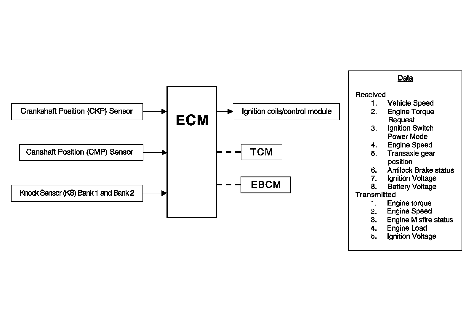 The electronic ignition (EI) system produces and controls the high energy secondary spark. This spark ignites the compressed air/fuel mixture at precisely the correct time, providing optimal performance, fuel economy, and control of exhaust emissions. The engine control module (ECM) primarily collects information from the crankshaft position (CKP) and camshaft position (CMP) sensors to control the sequence, dwell, and timing of the spark.