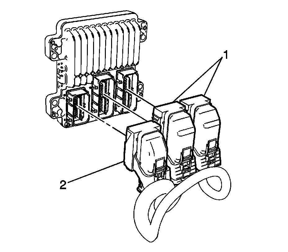 7. Disconnect the body wiring harness electrical connector (2) from the ECM.