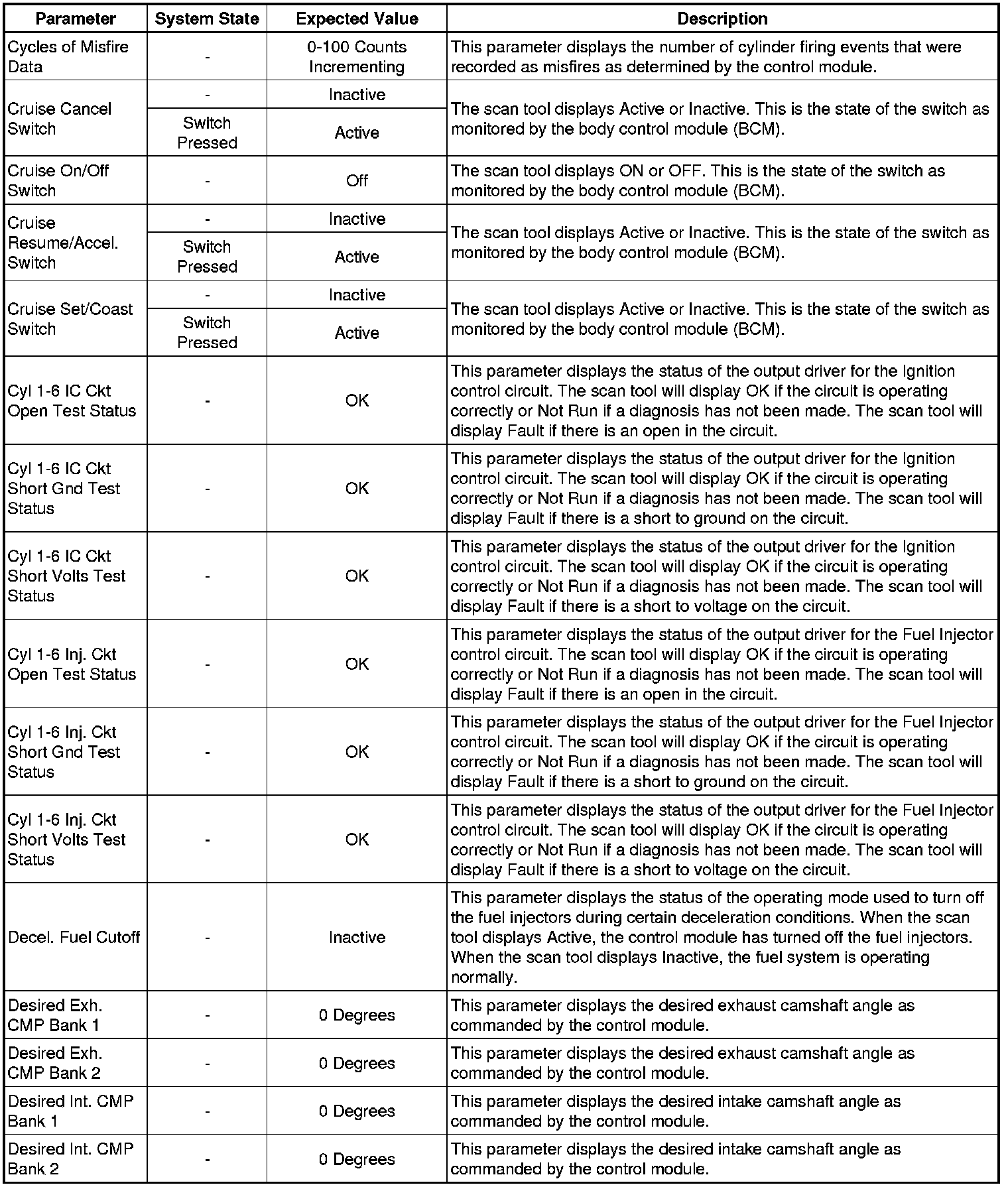 The Engine Control Module Scan Tool Data List contains all engine-related parameters that are available on the scan tool. The list is arranged in alphabetical order. A given parameter may appear in any one of the data lists, and in some cases may appear more than once, or in more than one data list in order to group certain related parameters together.