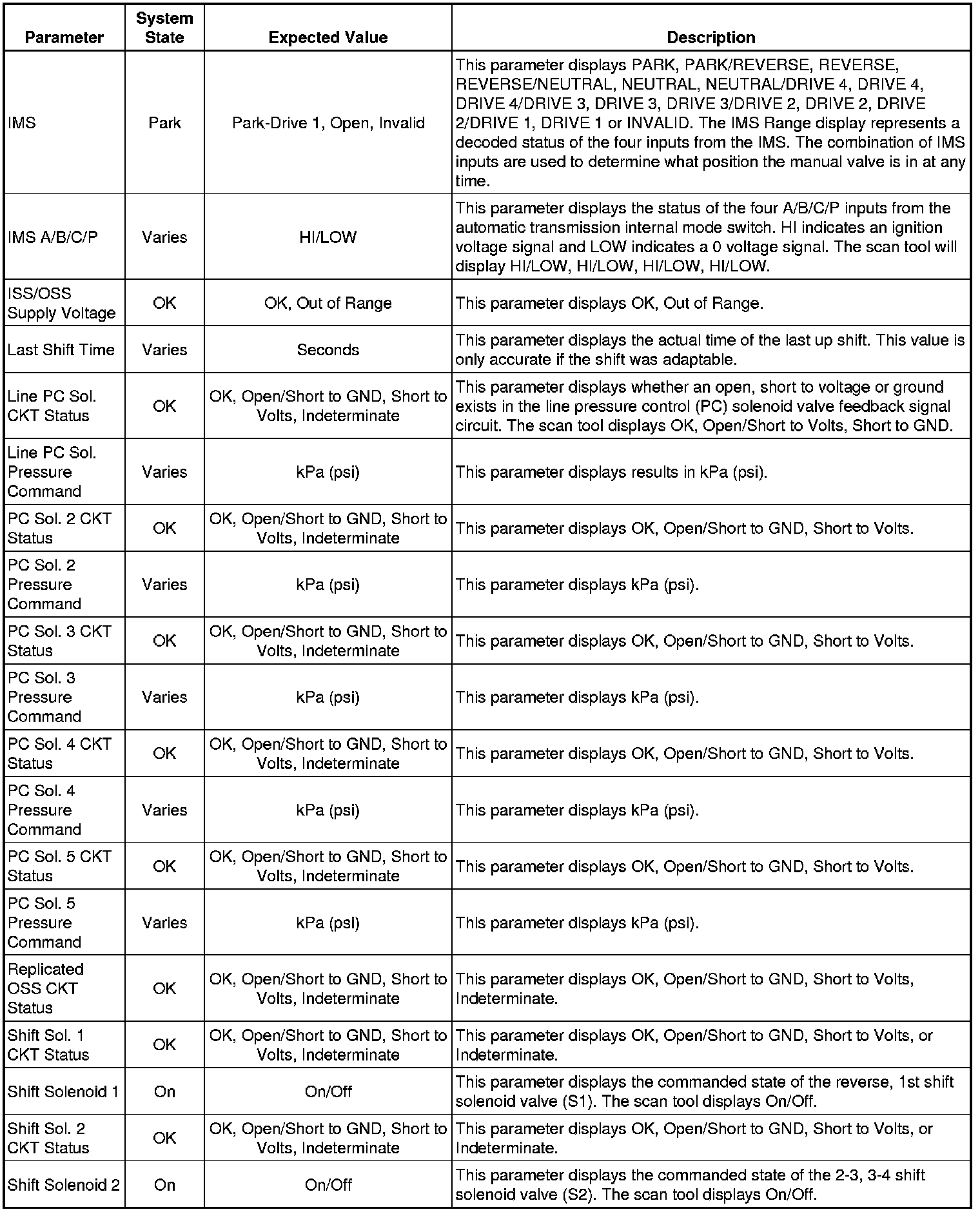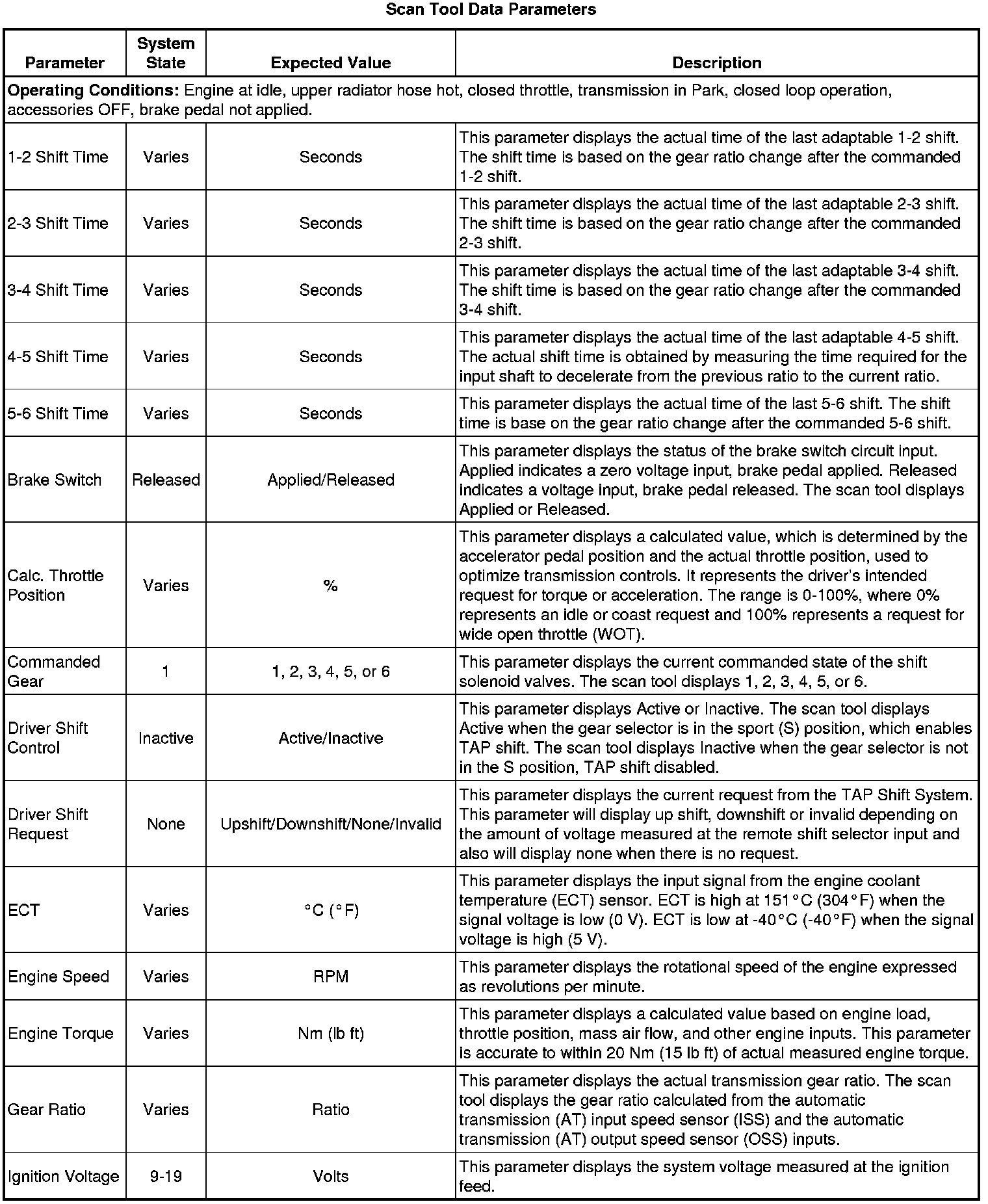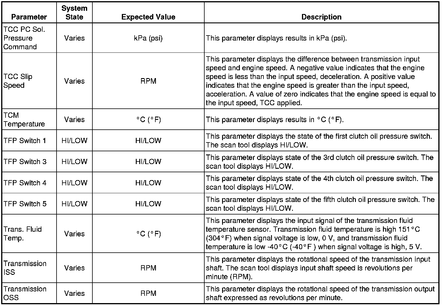 The Transmission Control Module Scan Tool Data List contains all transmission related parameters that are available on the scan tool. The list is arranged in alphabetical order. A given parameter may appear in any one of the data lists, and in some cases may appear more than once, or in more than one data list in order to group certain related parameters together.