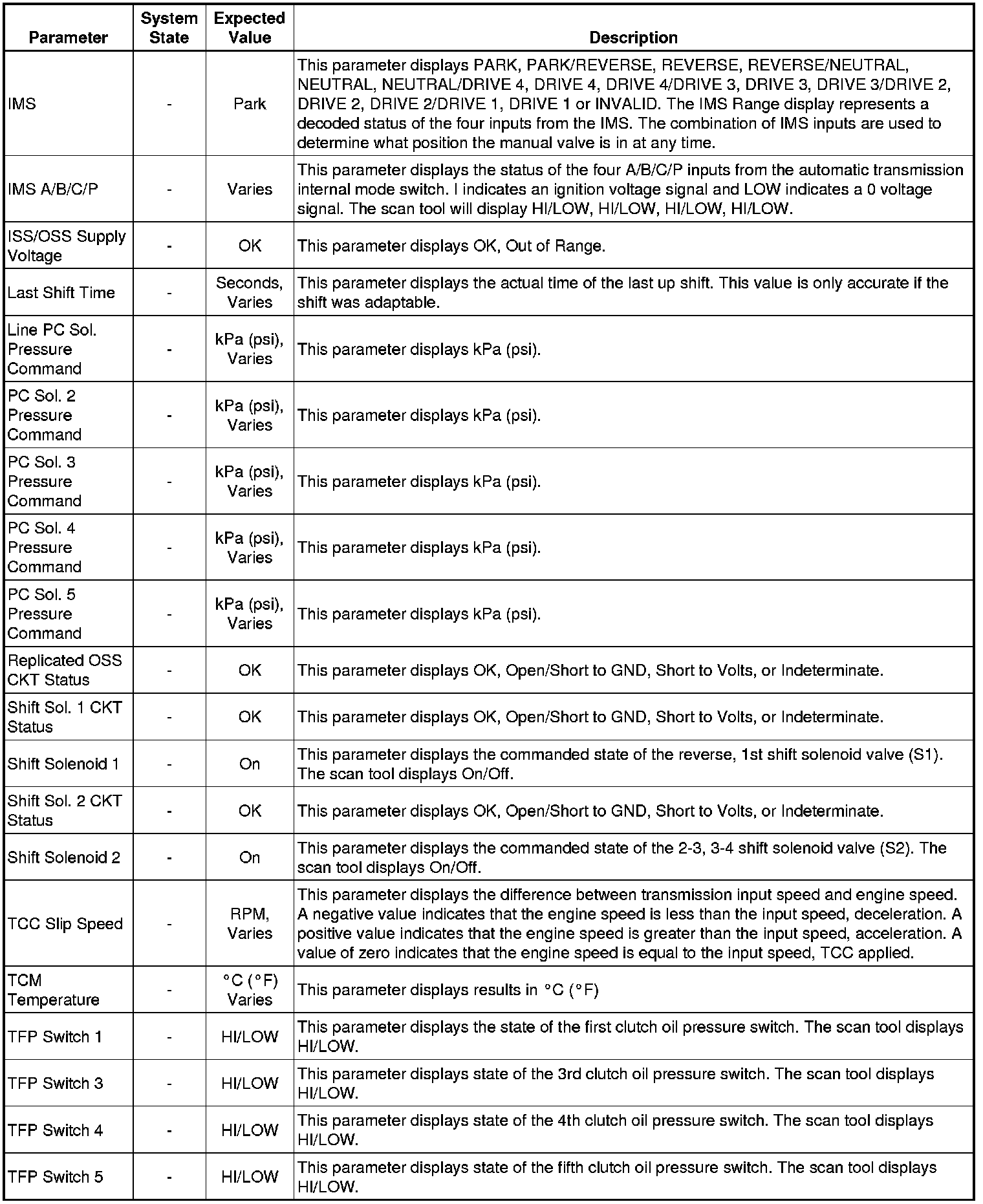 The Transmission Control Module Scan Tool Data List contains all transmission related parameters that are available on the scan tool. The list is arranged in alphabetical order. A given parameter may appear in any one of the data lists, and in some cases may appear more than once, or in more than one data list in order to group certain related parameters together.