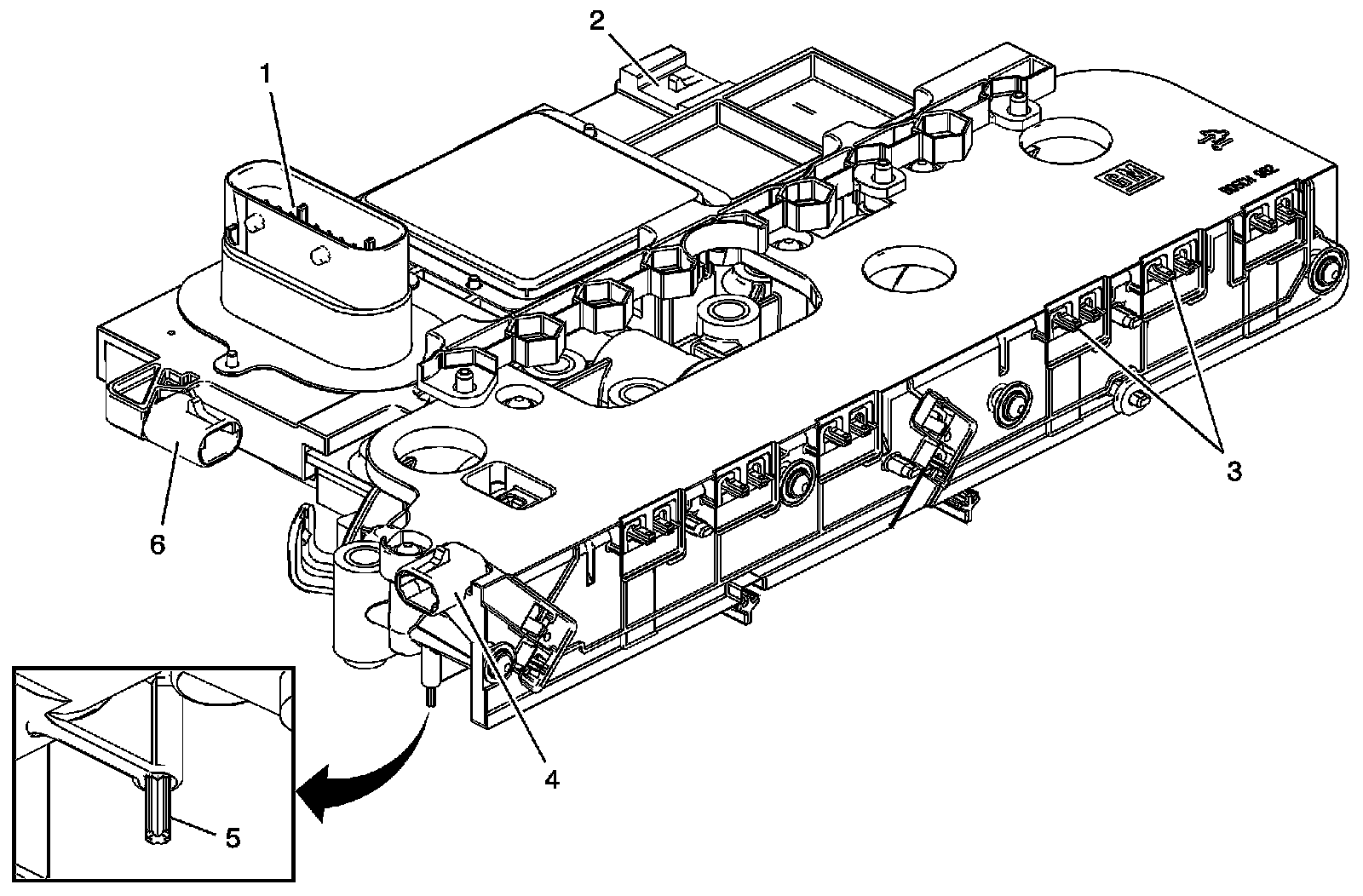 4. Inspect the 4 control solenoid (w/body and TCM) valve assembly filter plate retaining tabs (5) for cracks and ensure proper tension when filter plate is attached.