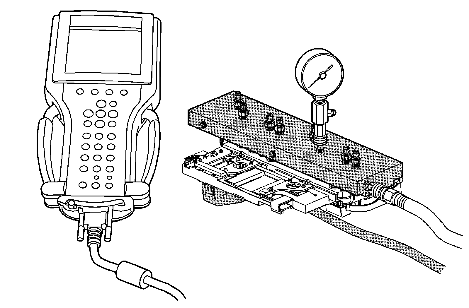 The purpose of this procedure is to test the functionality of the control solenoid (w/body and TCM) valve assembly solenoids for a gross stuck open or stuck closed condition. The DT-47825-100 test block is bolted to the control solenoid (w/body and TCM) valve assembly on the valve body mounting surface. Pressurized air is passed into the aluminum test block, through the control solenoid (w/body and TCM) valve assembly solenoid passage and back to a pressure gage on the test block. The pressure gage indicates open if air pressure is passed through the solenoid, or closed if the solenoid is unable to pass air through. A scan tool is used to command the solenoids ON and OFF. While watching the pressure gage, one can determine the valve functionality. The recommended shop air pressure for this test is 90-100 psi.