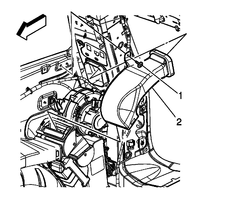 12. Remove the lower auxiliary air distributor duct (2). Refer to Auxiliary Air Distributor Lower Duct Replacement (Auxiliary Air Distributor Lower Duct Replacement).