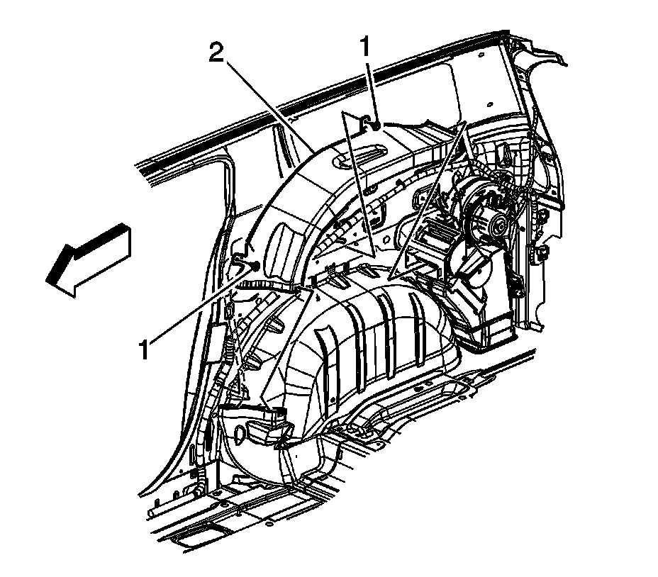 9. Remove the right rear quarter trim panel. Refer to Quarter Lower Rear Trim Panel Replacement (Traverse with TB5) (Service and Repair)Quarter Lower Rear Trim Panel Replacement (Traverse without TB4) (Service and Repair)Quarter Lower Rear Trim Panel Replacement (Acadia/OUTLOOK with TB5) (Service and Repair)Quarter Lower Rear Trim Panel Replacement (Acadia/OUTLOOK without TB4) (Service and Repair)Quarter Lower Rear Trim Panel Replacement (Enclave with TB5) (Service and Repair)Quarter Lower Rear Trim Panel Replacement (Enclave without TB4) (Service and Repair).