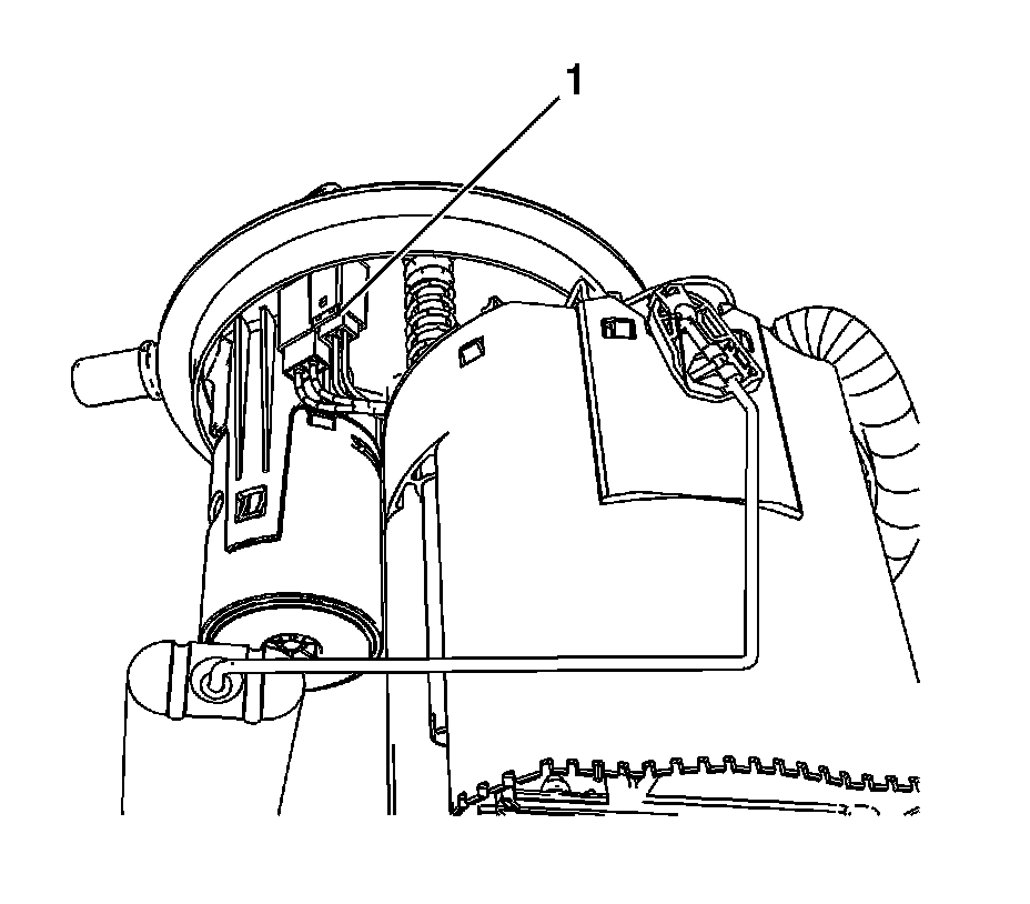 2. Push down on the fuel level sensor electrical connector tab (1), disengaging the retainer, and disconnect the electrical connector.