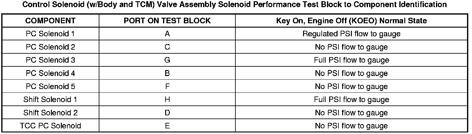 The purpose of this procedure is to test the functionality of the control solenoid (w/body and TCM) valve assembly solenoids for a gross stuck open or stuck closed condition. The DT-47825-100 test block is bolted to the control solenoid (w/body and TCM) valve assembly on the valve body mounting surface. Pressurized air is passed into the aluminum test block, through the control solenoid (w/body and TCM) valve assembly solenoid passage and back to a pressure gage on the test block. The pressure gage indicates open if air pressure is passed through the solenoid, or closed if the solenoid is unable to pass air through. A scan tool is used to command the solenoids ON and OFF. While watching the pressure gage, one can determine the valve functionality. The recommended shop air pressure for this test is 90-100 psi.