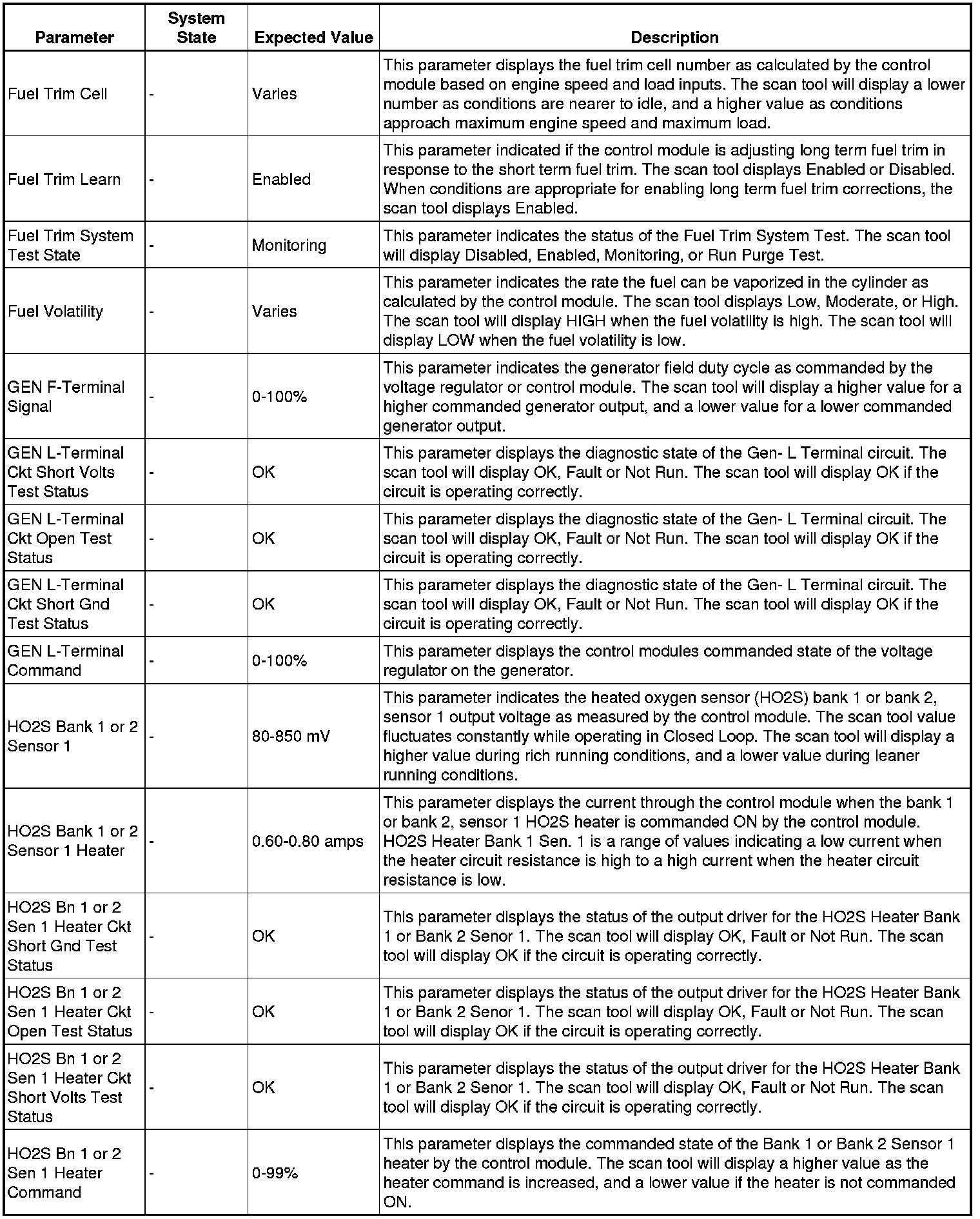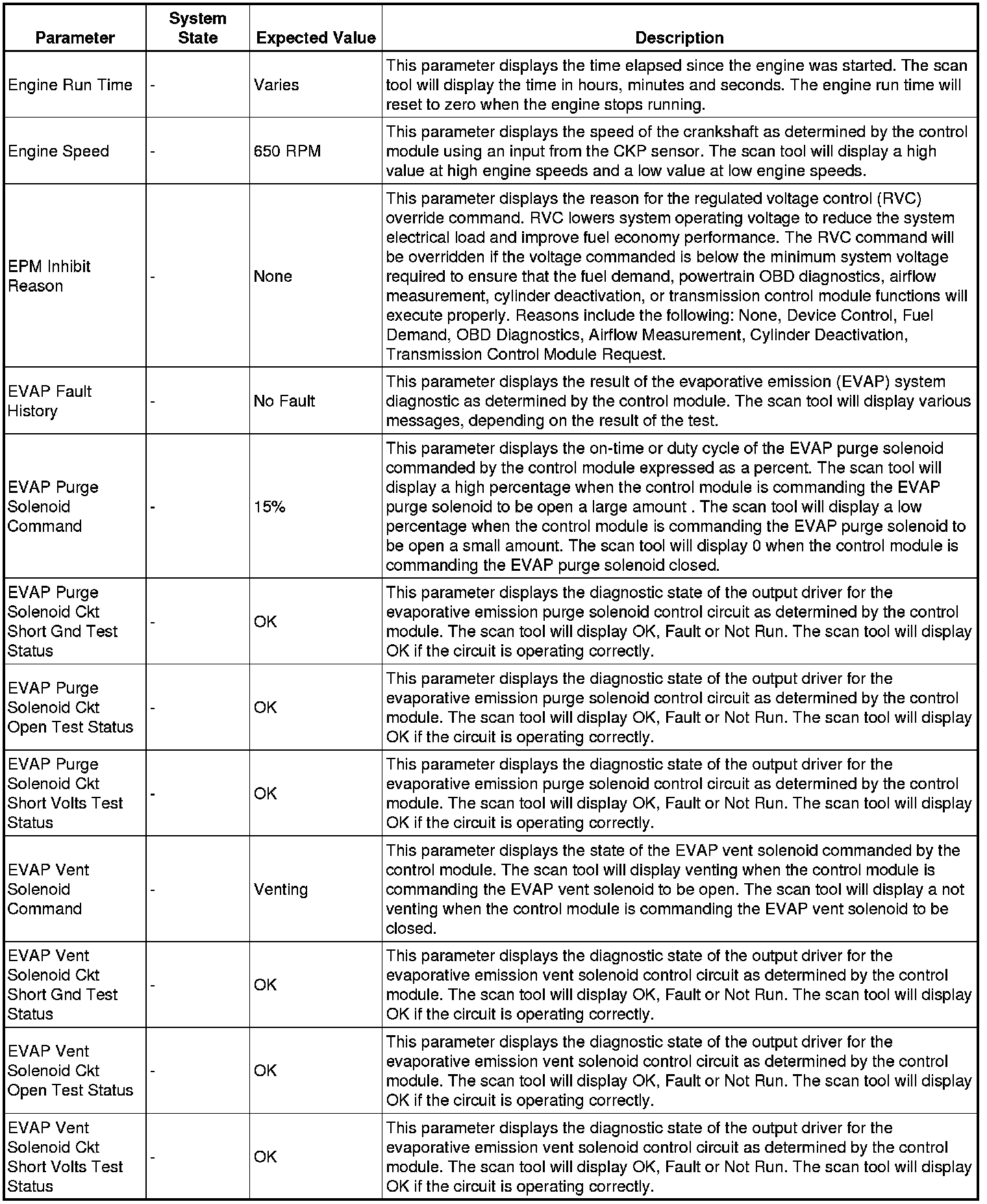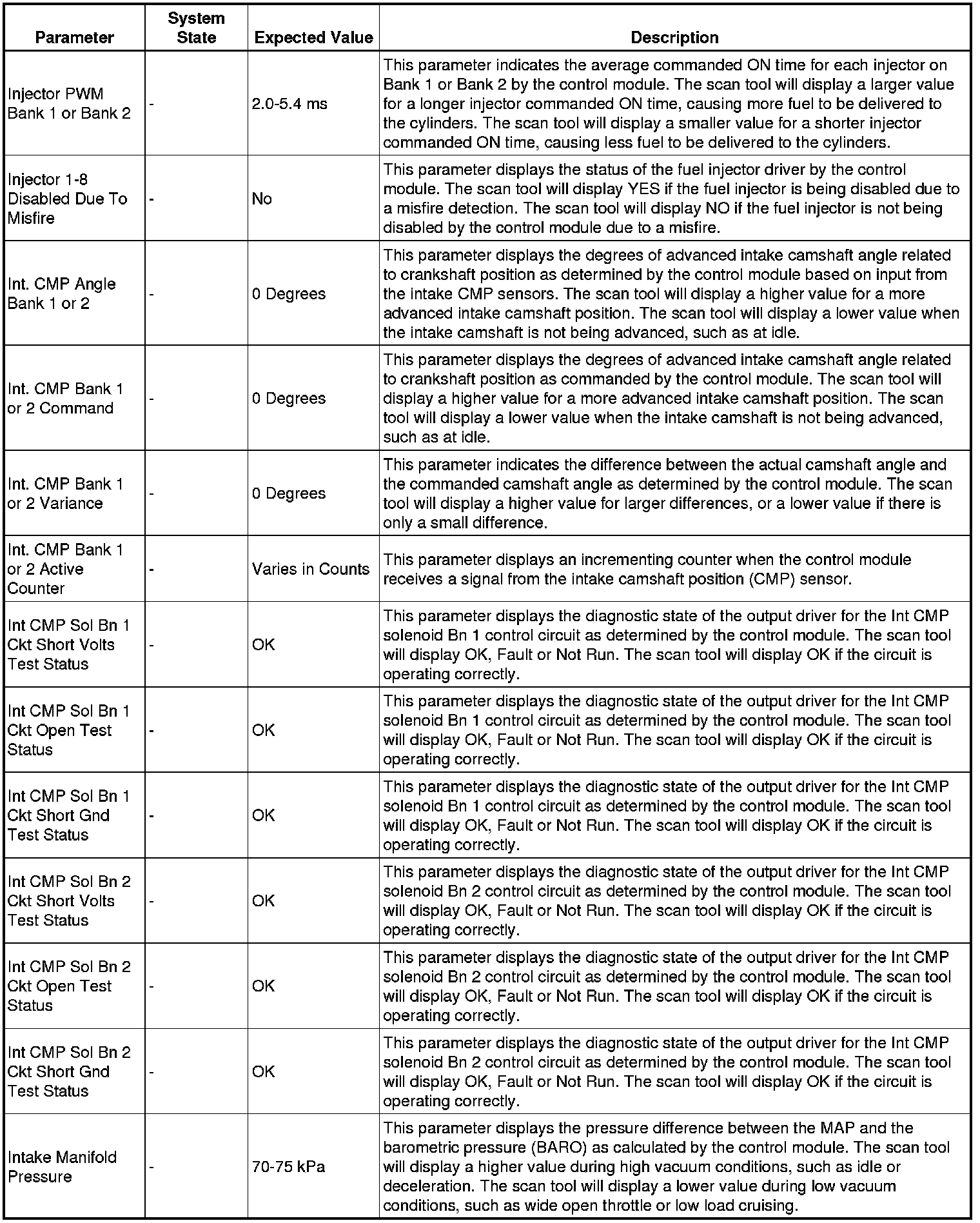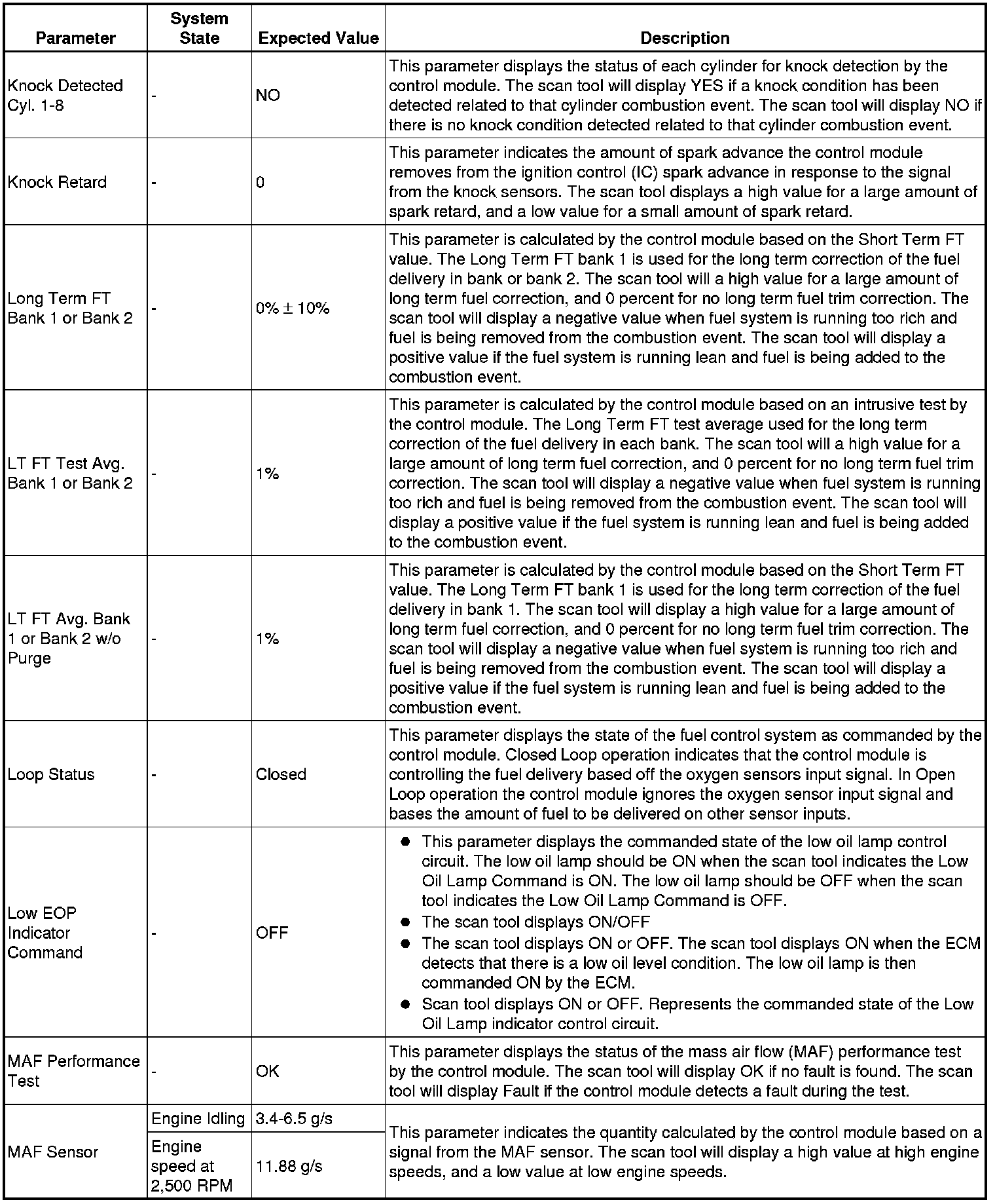 The scan tool values from a properly running engine may be used for comparison with the engine you are diagnosing. The engine scan tool data list represents values that would be seen on a normally running engine.
