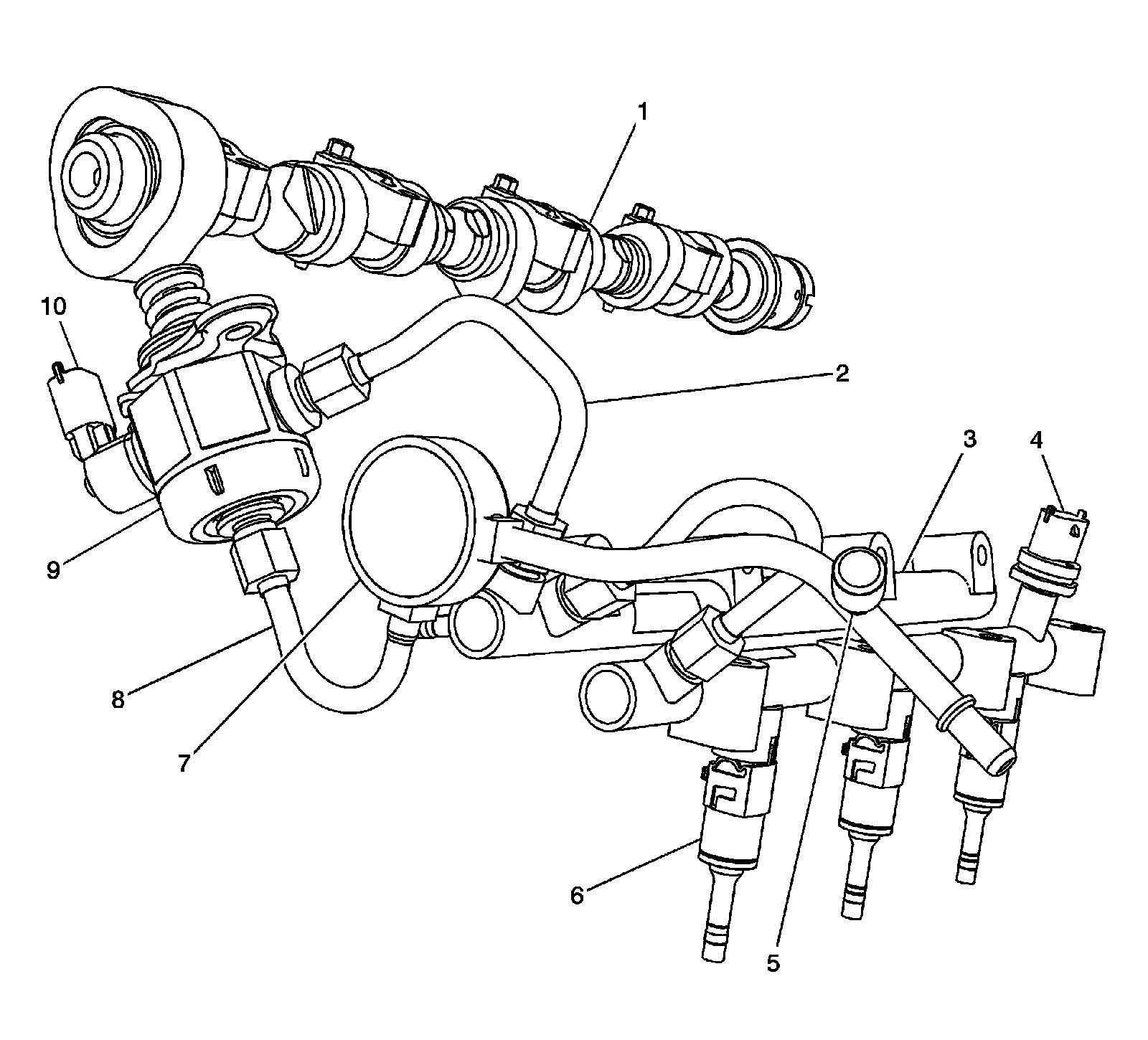 The high pressure fuel pump (9) is a mechanical one cylinder design driven by an eccentric on the exhaust camshaft (1) of bank 2. High pressure fuel is regulated by the high pressure fuel pump actuator, which is a part of the high pressure fuel pump. The high pressure fuel pump actuator is a magnetic actuator which controls the inlet valve of the high pressure pump. The ECM provides battery voltage on the actuator high control circuit and ground on the actuator low control circuit. Both circuits are controlled by the ECM. When the ECM deactivates the high pressure fuel pump actuator, both circuits are disabled and the inlet valve is held open with spring pressure. When the ECM activates the high pressure fuel pump actuator, the low control circuit driver connects the low control circuit to ground and the high control circuit driver pulse-width modulates (PWM) the high control circuit. The ECM uses the camshaft and crankshaft position sensor inputs to synchronize the high pressure fuel pump actuator with the position of the eccentric on the camshaft. The ECM regulates fuel pressure by adjusting the portion of each pump stroke that provides fuel to the rail. The high pressure fuel pump also contains an integrated pressure relief valve.