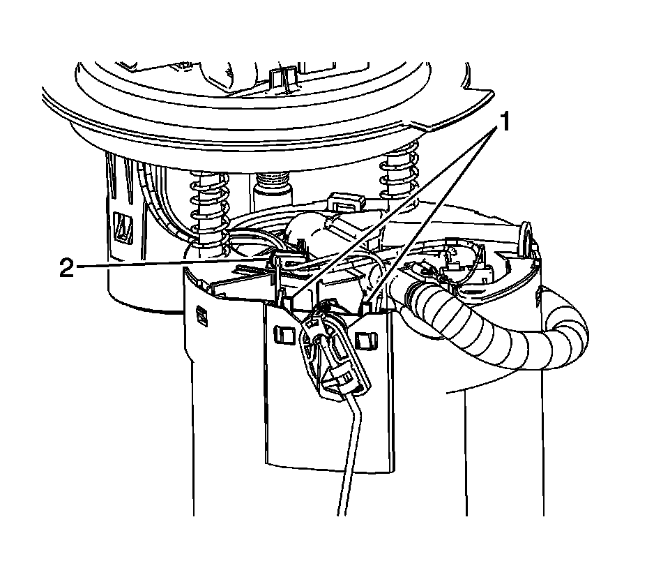 4. Push in the fuel level sensor tabs (1) disengaging the sensor clips from the module bucket.