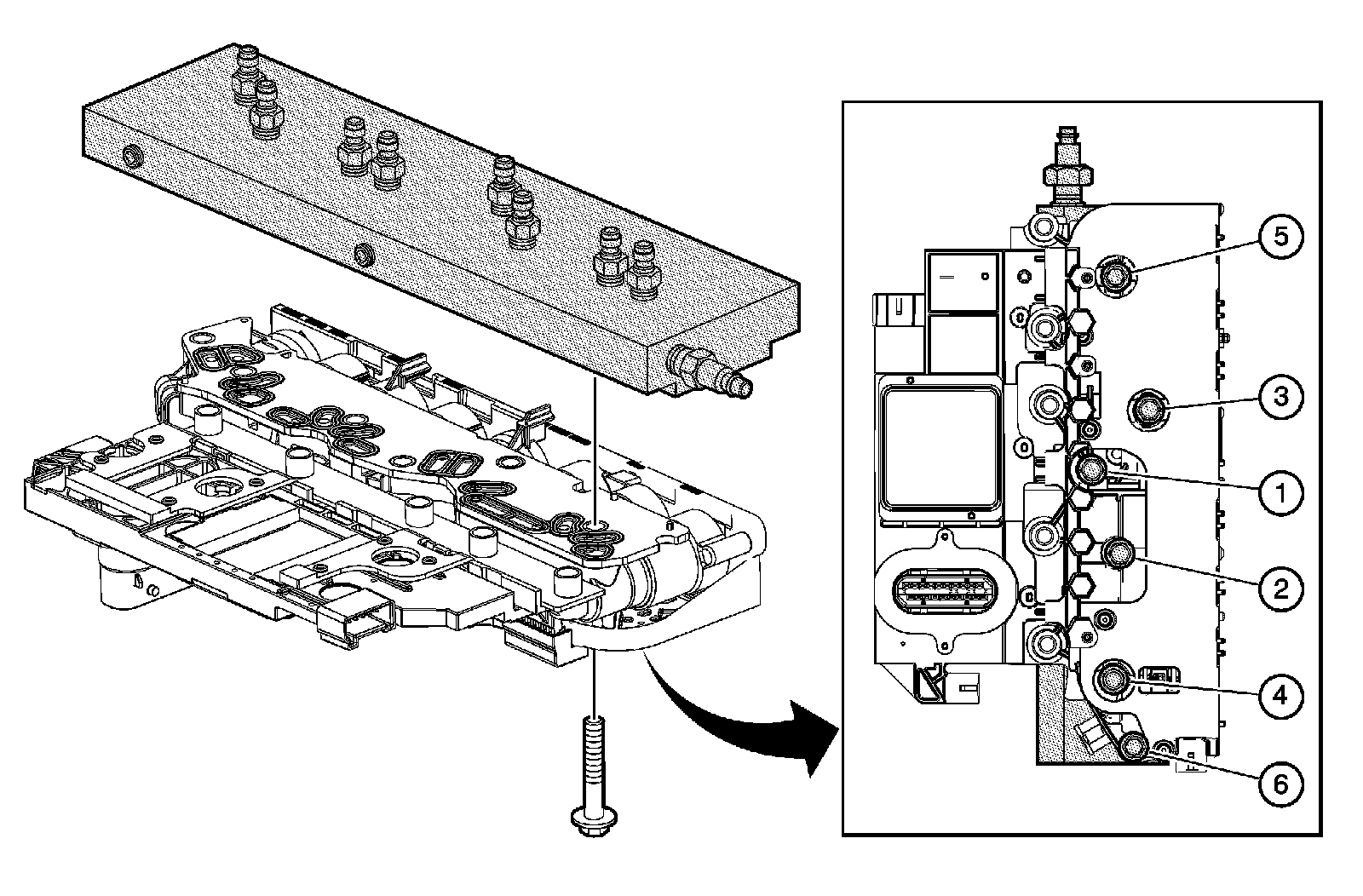 2. Bolt the DT-47825-100 - test plate to the control solenoid valve assembly on the valve body mounting surface. Use the bolts and washers supplied with the tool to attach the test plate. Tighten the bolts to 5 Nm (44 lb in) using a center out alternating torque sequence.