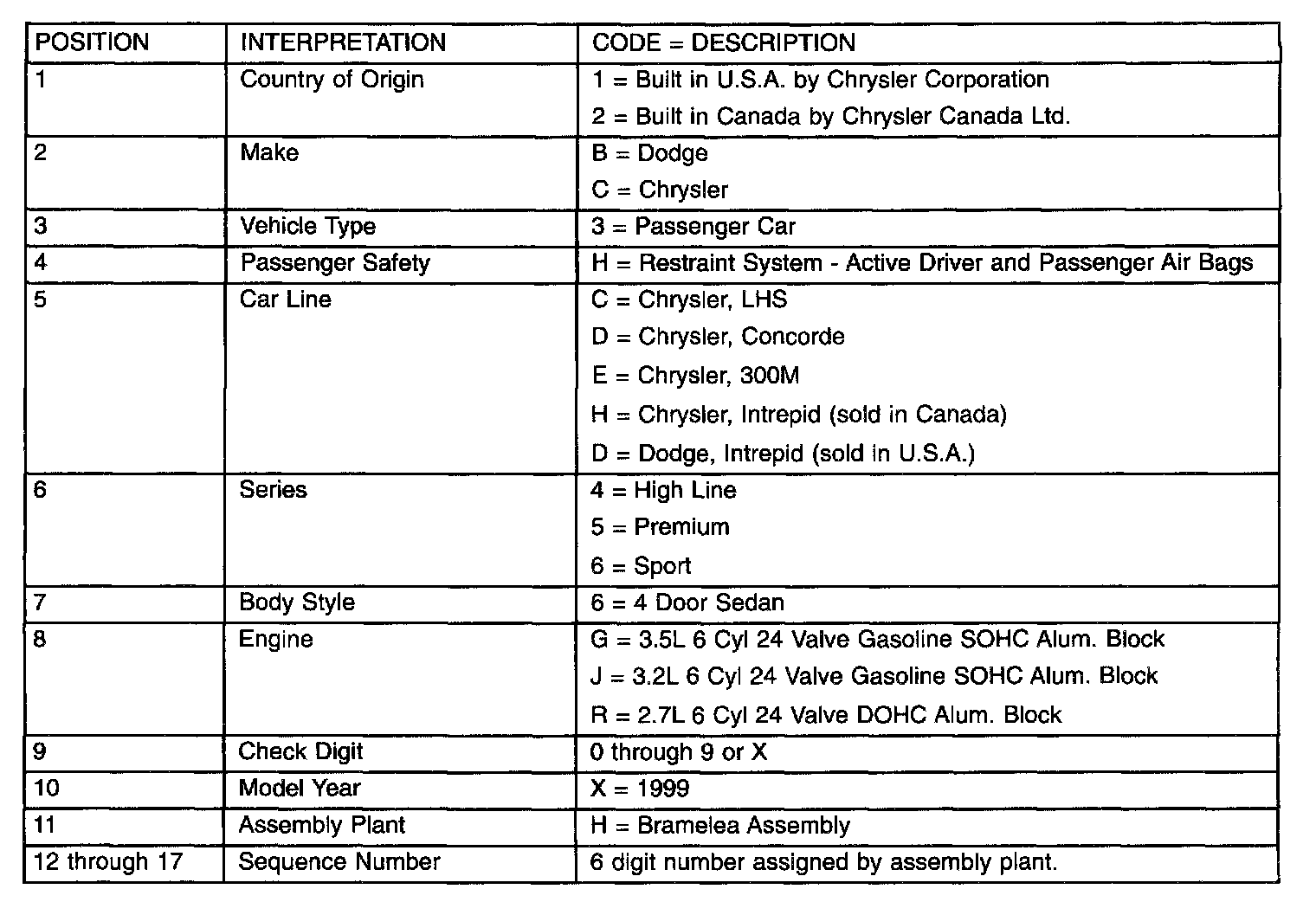 The Vehicle Identification Number (VIN) is located on the upper left corner of the instrument panel, near the left windshield pillar. The VIN consists of 17 characters in a combination of letters and numbers that provide specific information about the vehicle, Refer to VIN Code Breakdown table for decoding information.