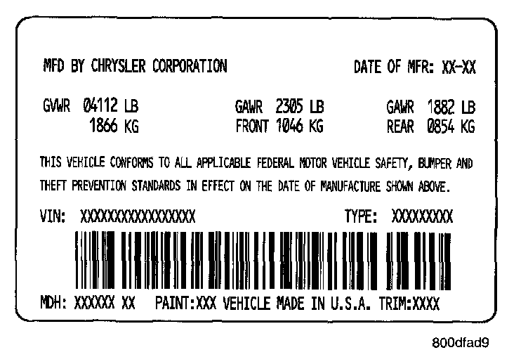 A vehicle safety certification label is attached to the left side B-pillar. This label indicates date of manufacture (month and year), Gross Vehicle Weight Rating (GVWR), Gross Axle Weight Rating (GAWR) front, Gross Axle Weight Rating (GAWR) rear and the Vehicle Identification Number (VIN). The Month, Day and Hour of manufacture is also included.