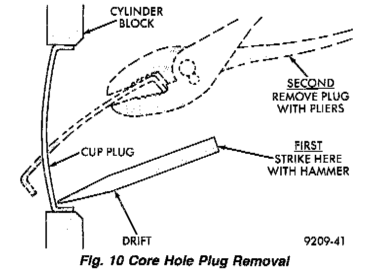 Using a blunt tool such as a drift or a screwdriver and a hammer, strike the bottom edge of the cup plug. With the cup plug rotated, grasp firmly with pliers or other suitable tool and remove plug.