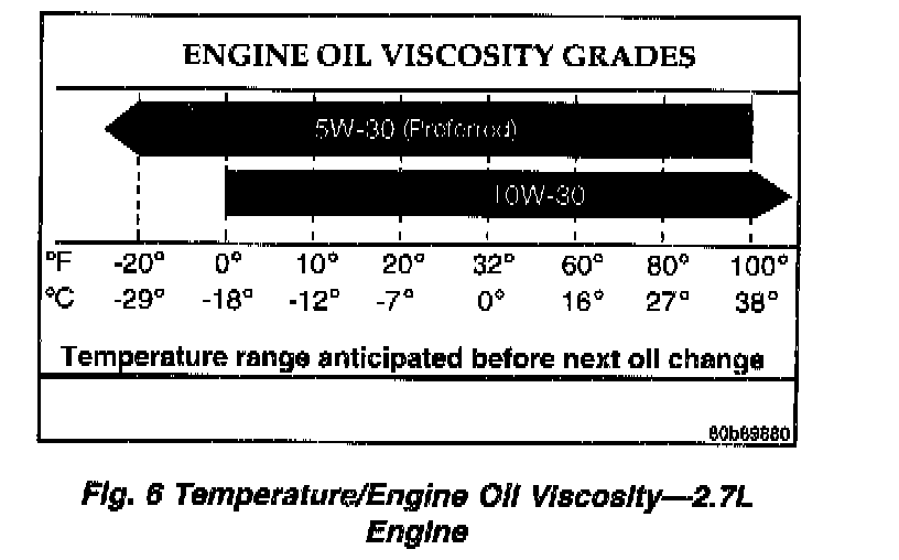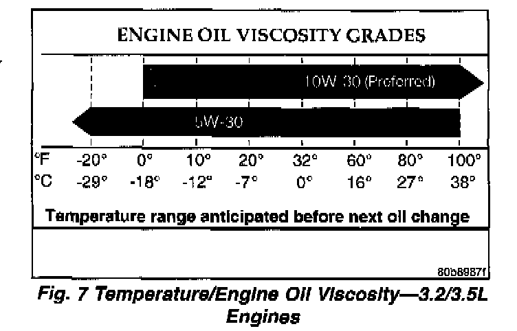 An SAE viscosity grade is used to specify the viscosity of engine oil. Use only engine oils with multiple viscosities such as 5W-30 or 10W-30. 10W-30 oil is preferred in the 3.2/3.5L engine. 5W-30 engine oil is preferred in the 2.7L engine. These oils are specified with a dual SAE viscosity grade, which indicates the cold-to-hot temperature viscosity range. Select an engine oil that is best suited to your particular temperature range and variation.