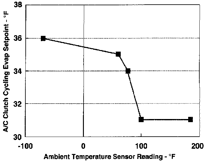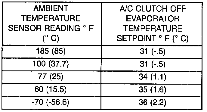 The evaporator temperature sensor is a temperature sensing element located at the coldest point on the face of the evaporator. Output from the probe is sampled by the Body Control Module (BCM). The sensor is used to switch the A/C compressor clutch OFF before evaporator freeze up occurs. The temperature set point at which the clutch is turned OFF varies with the outside ambient temperature. The temperature at which the clutch is turned ON is preset to 2° F above the OFF setpoint mentioned above. Refer to Evaporator Temperature Sensor Set point table for the correct setpoint.