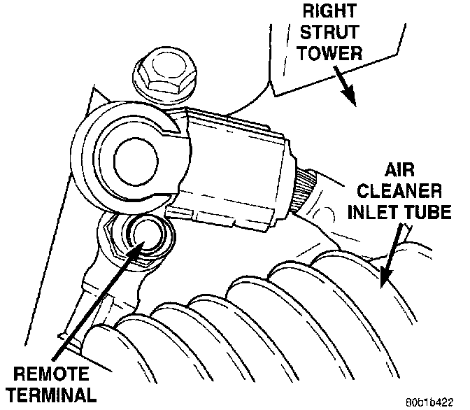 1. Open hood and disconnect the negative battery cable remote terminal from the remote battery post.