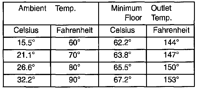 Engine coolant is provided to the heater system by two 19 mm (3/4 inch inside diameter) heater hoses. With engine idling at normal running temperature, set the control to maximum heat, floor, and high blower setting. Using a test thermometer, check the air temperature coming from the floor outlets. Refer to Temperature Reference Table.