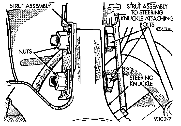 CAUTION: The bolts attaching the strut to the steering knuckle are serrated in the area where they go through the steering knuckle and strut. When removing, do not turn the bolts in the steering knuckle. If bolts are turned in the steering knuckle, damage to the steering knuckle will result.