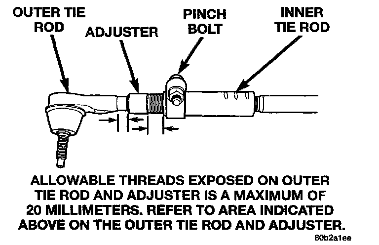 CAUTION: When setting toe on vehicle, the maximum dimension of exposed threads allowed on inner and outer tie rod cannot exceed the distance shown. If the maximum distance is exceeded, inadequate retention of either inner or outer tie rod may result. Ensure that adjustment pinch bolt is torqued to required specification when Toe setting procedure is completed.