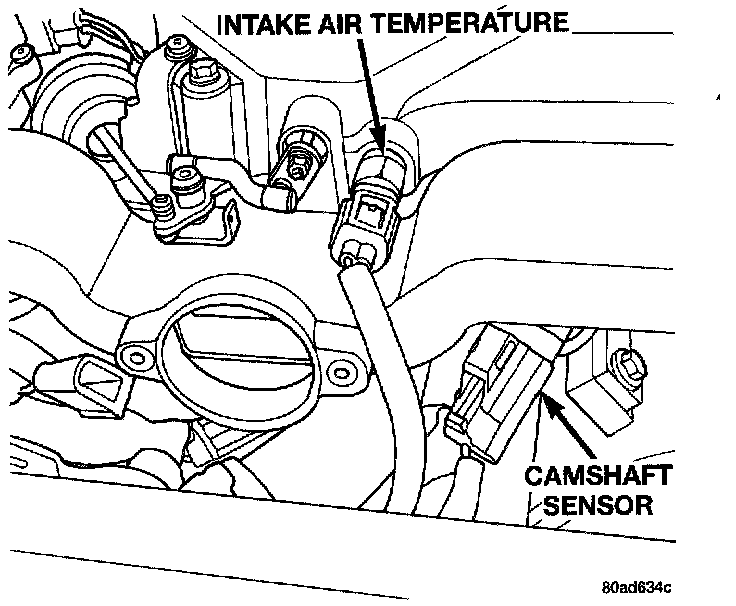 The camshaft position sensor is mounted in the front of the timing case cover above the left camshaft sprocket.